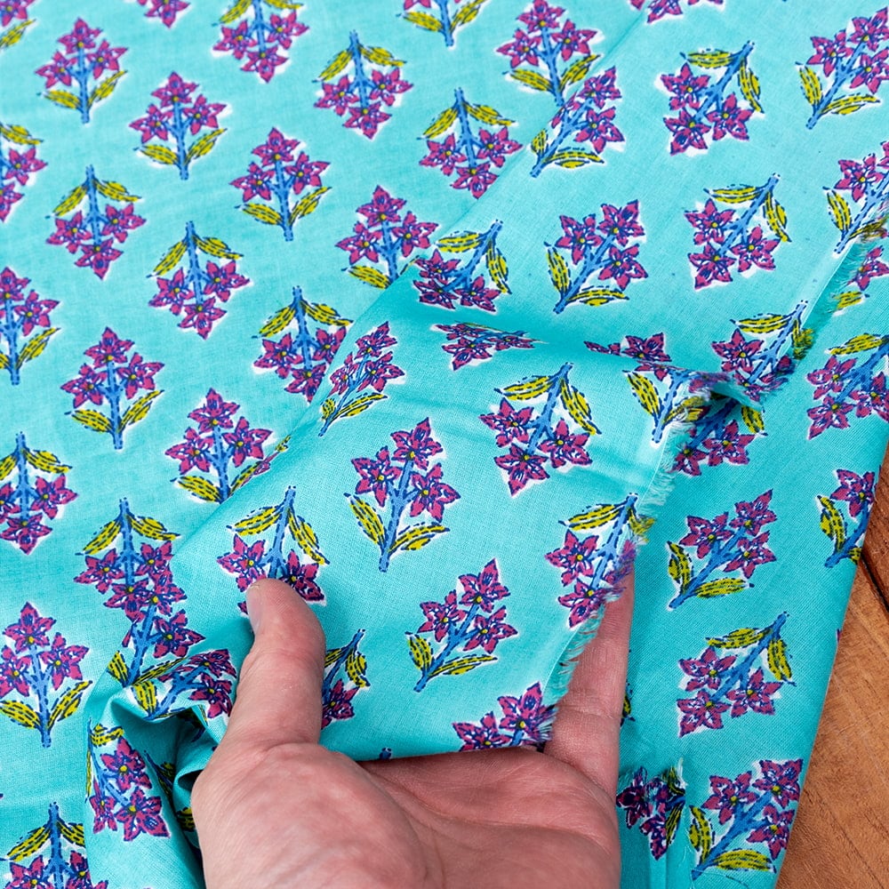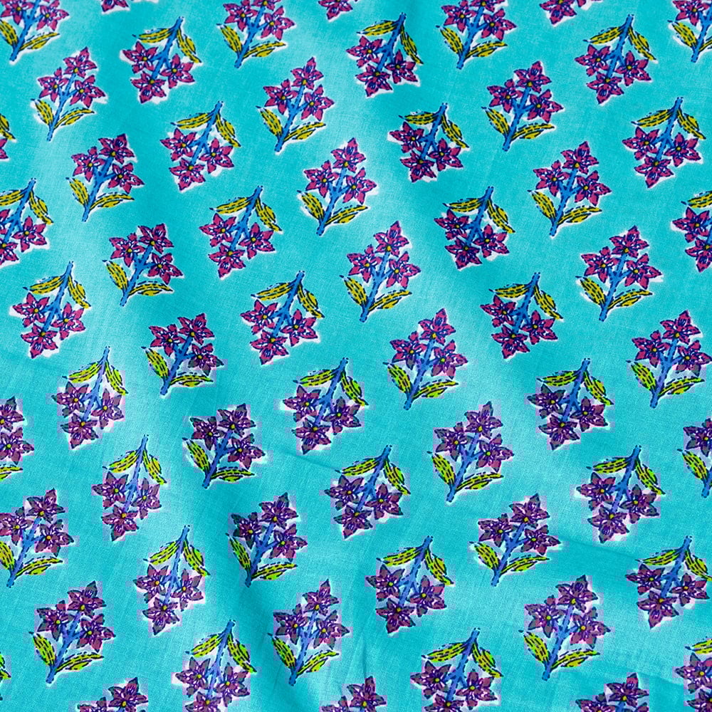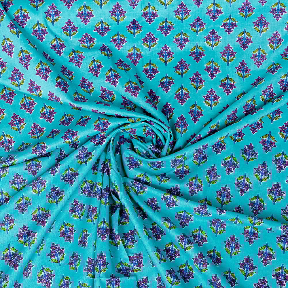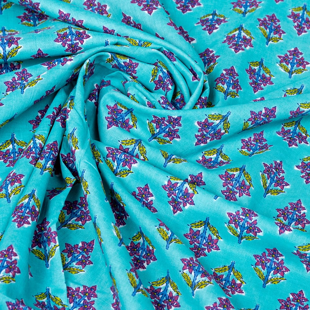 【3個セット】〔1m単位切り売り〕テキスタイルの伝統息づくインドから 昔ながらの小花柄布 青緑系〔幅約105cm〕