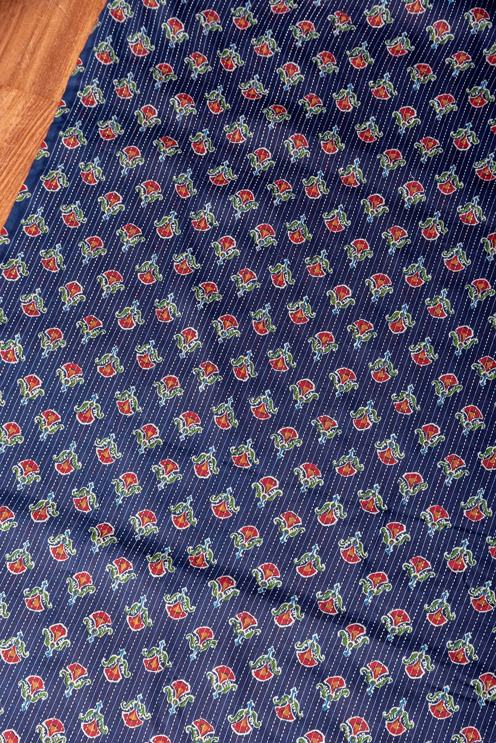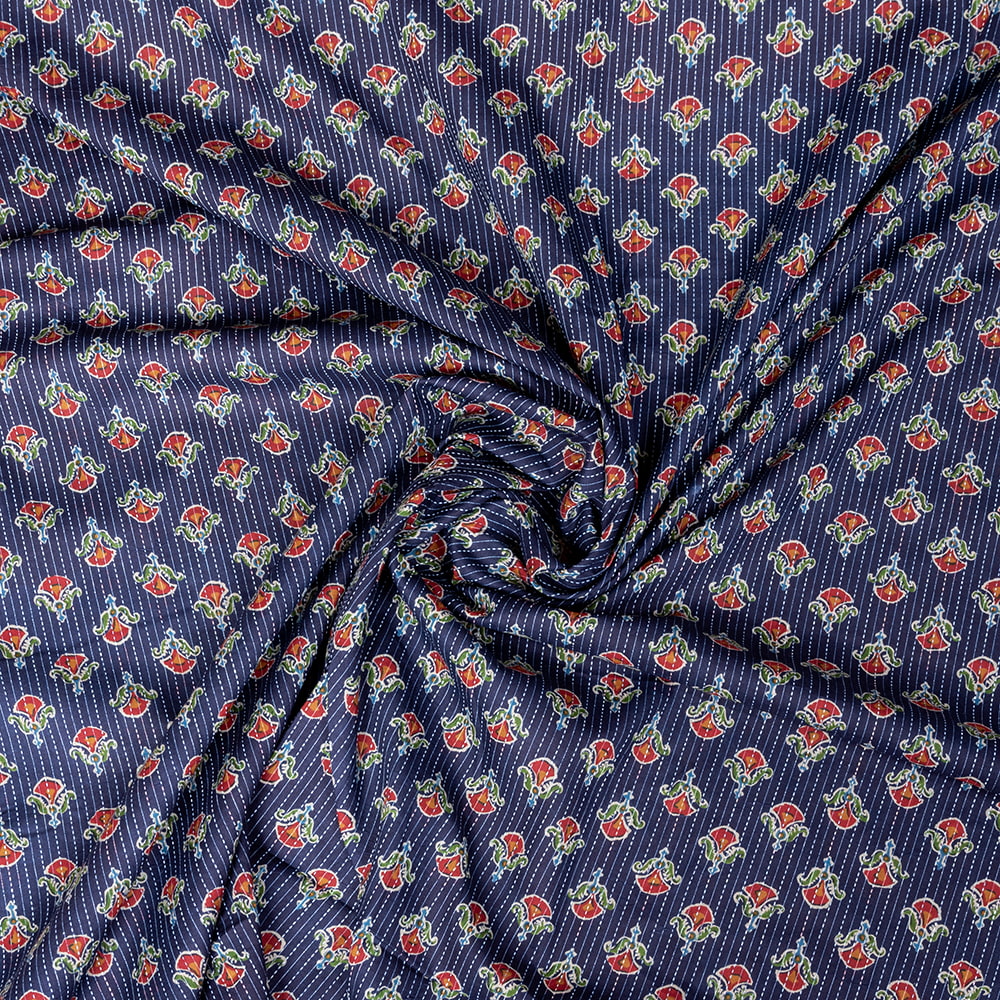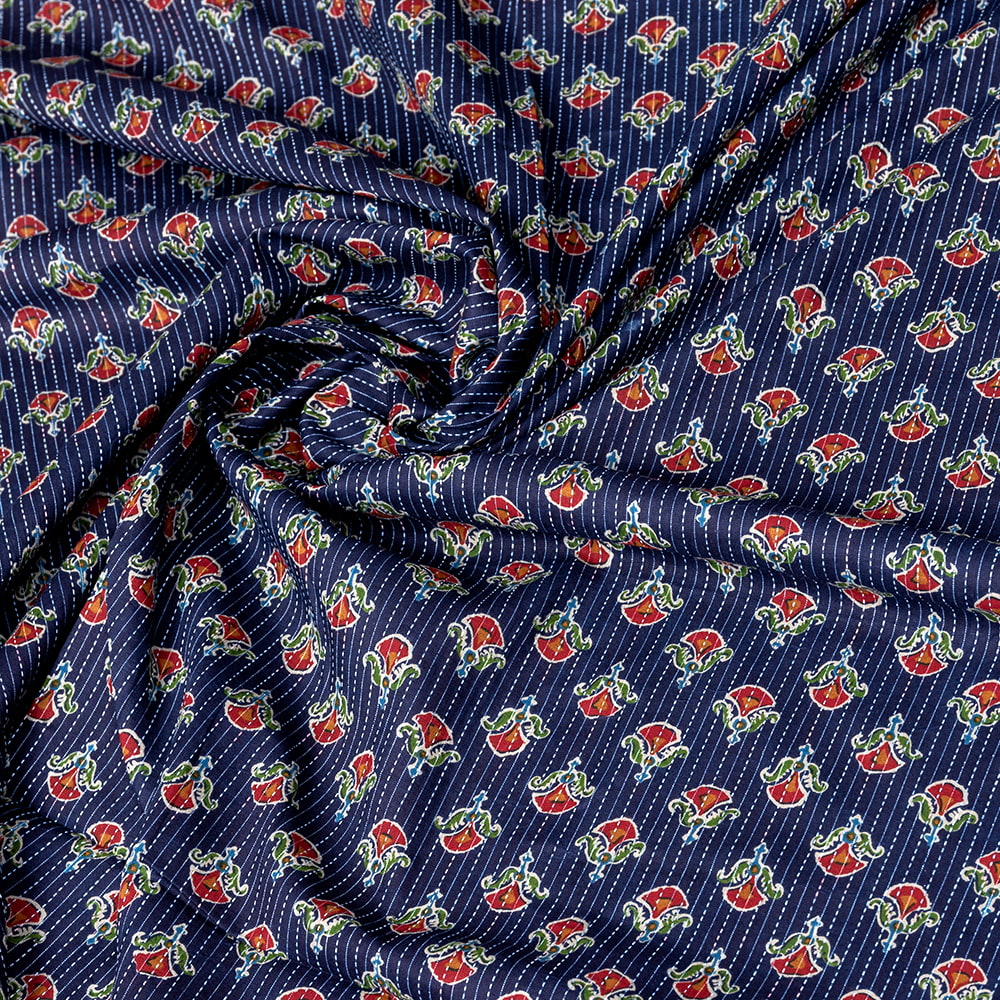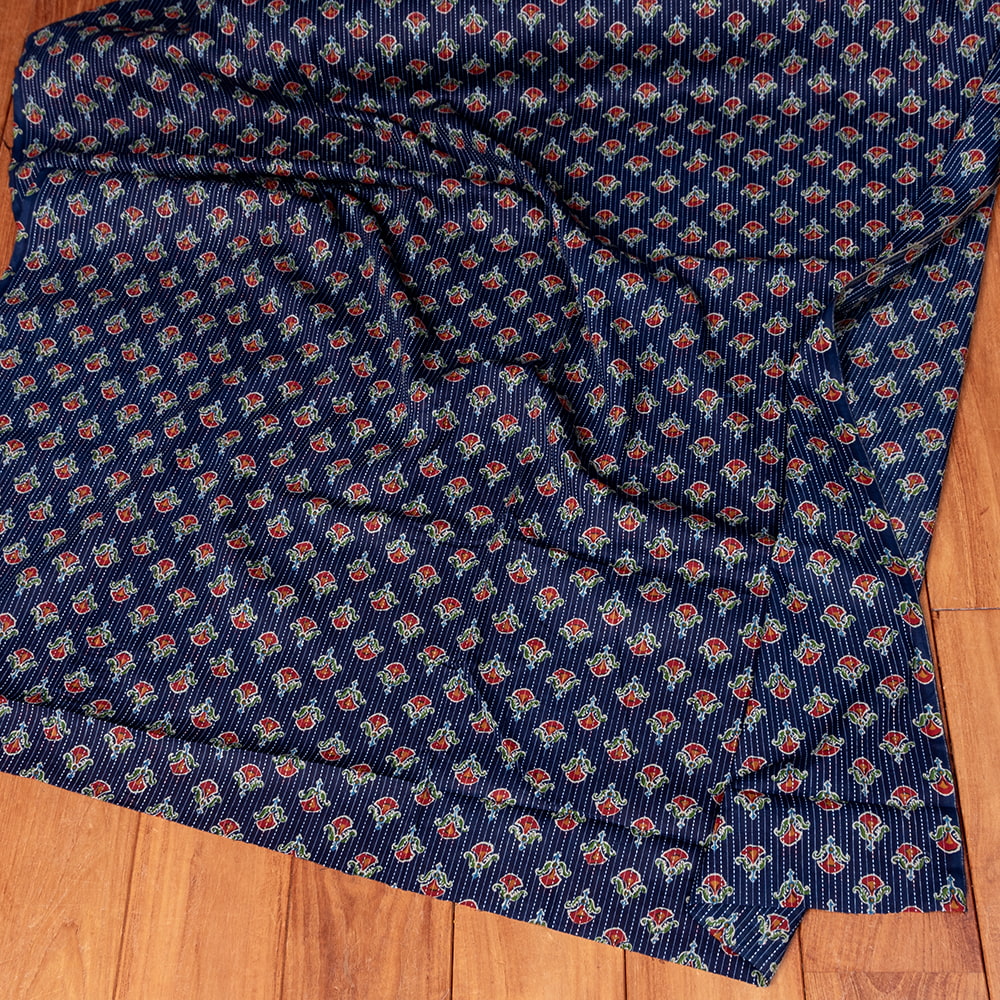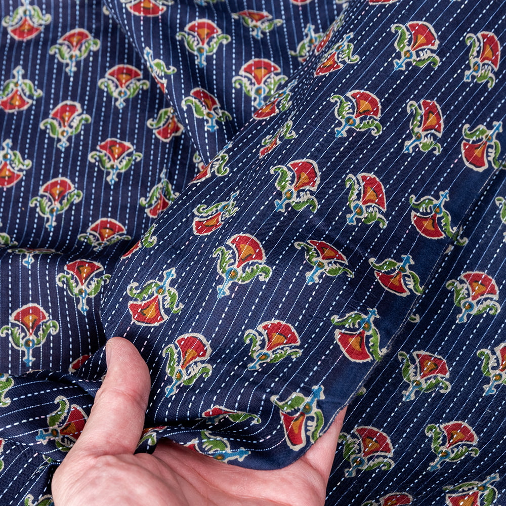 この生地は、インドの自然と伝統工芸が融合した特別な一枚です。インドが得意とするボタニカル柄が、伝統的なシルクスクリーンプリントで丁寧に描かれており、自然の美しさを感じさせます。鮮やかな花やボタニカルなデザインが広がる生地に、インド伝統のカンタ刺繍による、ランニング・ステッチが加わることで、生地に立体感と、温かみのある風合いが生まれ、とてもかわいい雰囲気に仕上がっています。