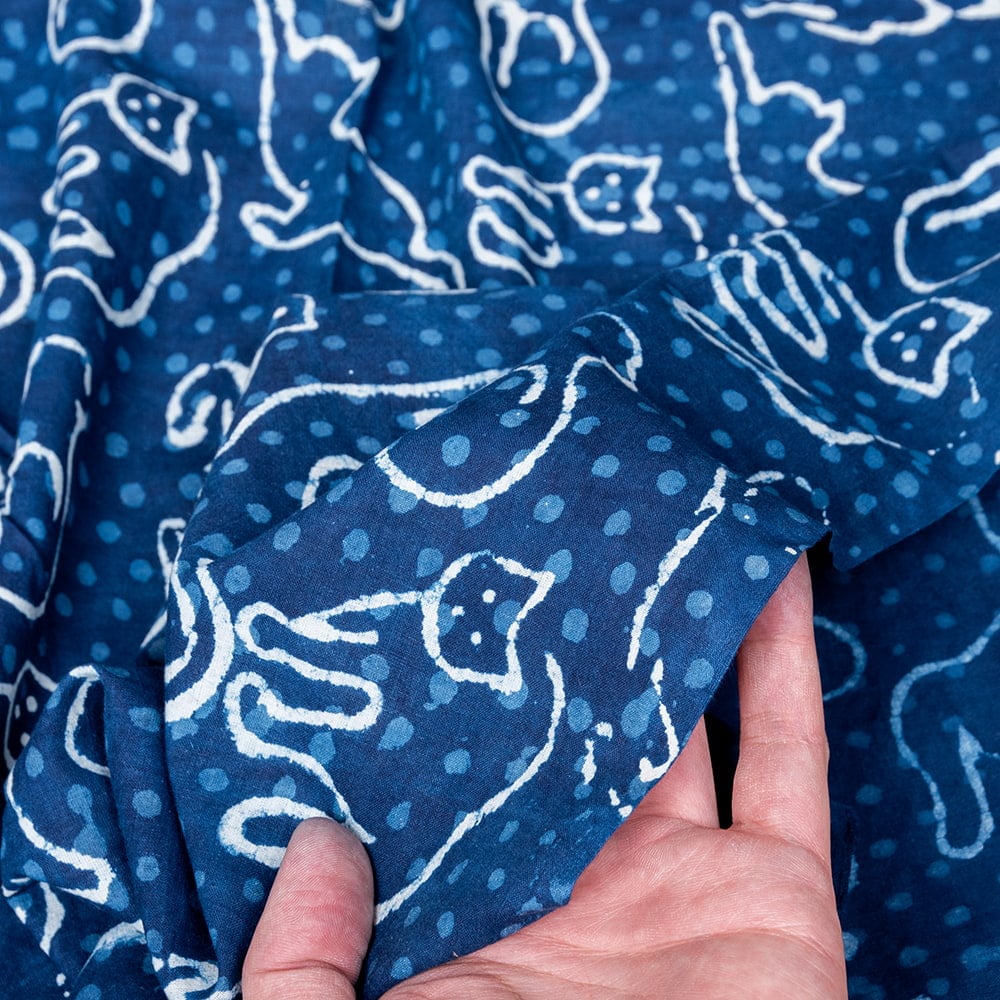 【5個セット】〔1m単位切り売り〕インドの伝統息づく 昔ながらの木版インディゴ藍染布 猫 ネイビー系〔幅約113cm〕