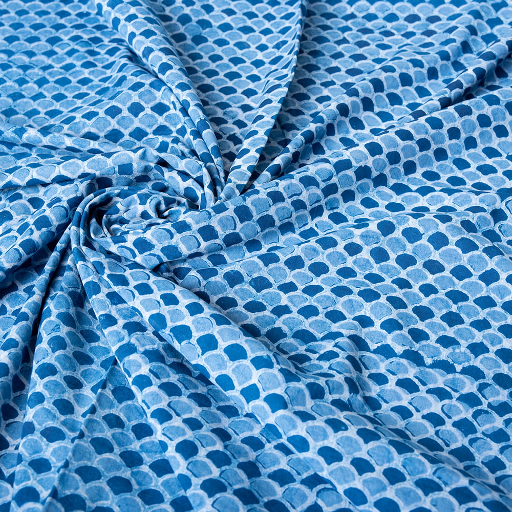 インドらしい伝統的な模様にインディゴの美しい青がマッチングした素敵な布です。泥染め(ダブプリント)によるシンプルなパターンの連なりと落ち着いた風合いは見ていて決して飽きることがありません。泥染めは、布地が染まるのを防ぐ泥状のペーストを模様が彫られたウッドブロック(木版)につけて布に押していきます。そして布につけたペースとへ、細かくなった小麦の籾殻を撒きます。そうすると小麦の皮が先ほどの泥にくっついてくれるので天日干しします。