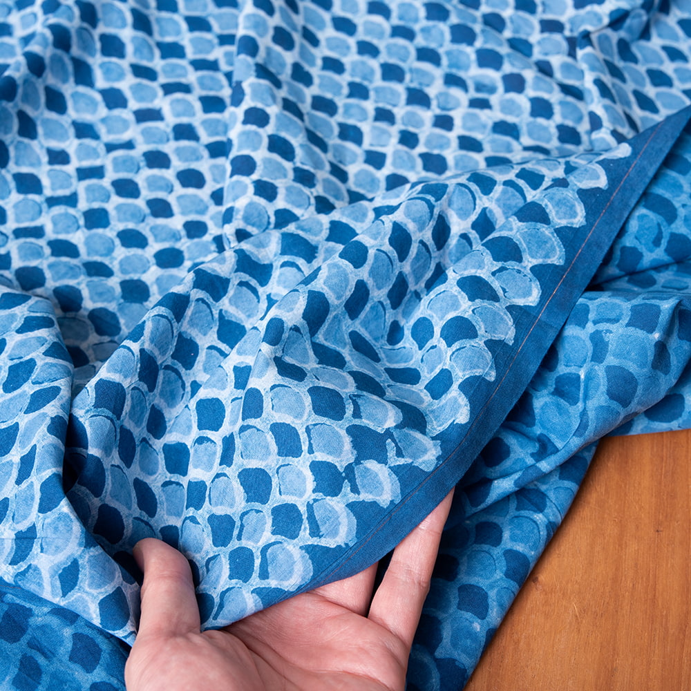 インディゴとの青による色合いが美しく、ウッドブロックの手作りによる模様もとても美しいこちらの布。手芸用の布としてはもちろんインテリア用のカバーや飾り布として様々な場所でお使いいただけます。ソファカバーやカーテン、テーブルクロス等々色々な使いみちが考えられますね。ナチュラルな風合いが良いので、オリジナルのスカーフや壁飾りにしても素敵です。■便利な計り売り!