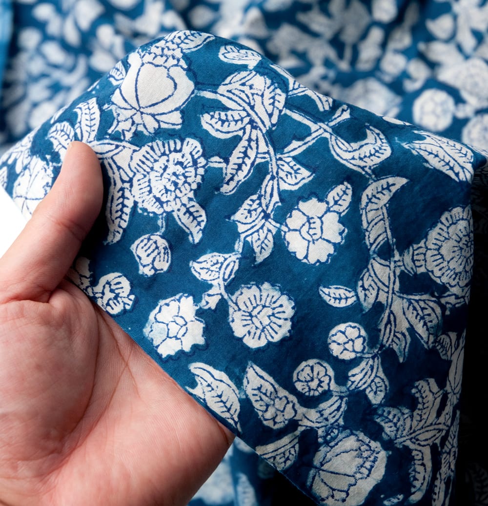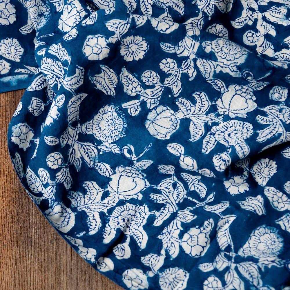インディゴとの青による色合いが美しく、ウッドブロックの手作りによる模様もとても美しいこちらの布。手芸用の布としてはもちろんインテリア用のカバーや飾り布として様々な場所でお使いいただけます。ソファカバーやカーテン、テーブルクロス等々色々な使いみちが考えられますね。ナチュラルな風合いが良いので、オリジナルのスカーフや壁飾りにしても素敵です。■便利な計り売り!