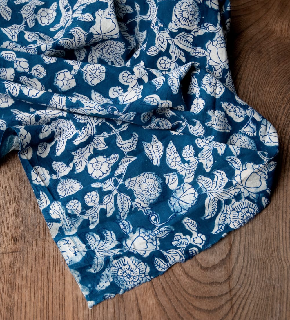 インドらしい伝統的な模様にインディゴの美しい青がマッチングした素敵な布です。泥染め(ダブプリント)によるシンプルなパターンの連なりと落ち着いた風合いは見ていて決して飽きることがありません。泥染めは、布地が染まるのを防ぐ泥状のペーストを模様が彫られたウッドブロック(木版)につけて布に押していきます。そして布につけたペースとへ、細かくなった小麦の籾殻を撒きます。そうすると小麦の皮が先ほどの泥にくっついてくれるので天日干しします。
