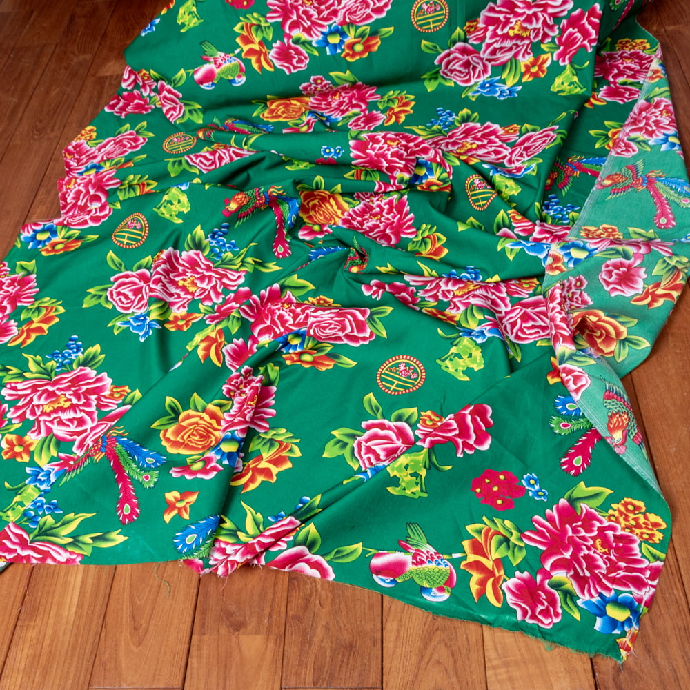 【3個セット】〔1m単位切り売り〕アジアのレトロ花柄ファブリック 生地 東北大花布 鳳凰牡丹 花鳥画 ヴィンテージ風 昭和レトロ〔約160cm〕 - グリーン