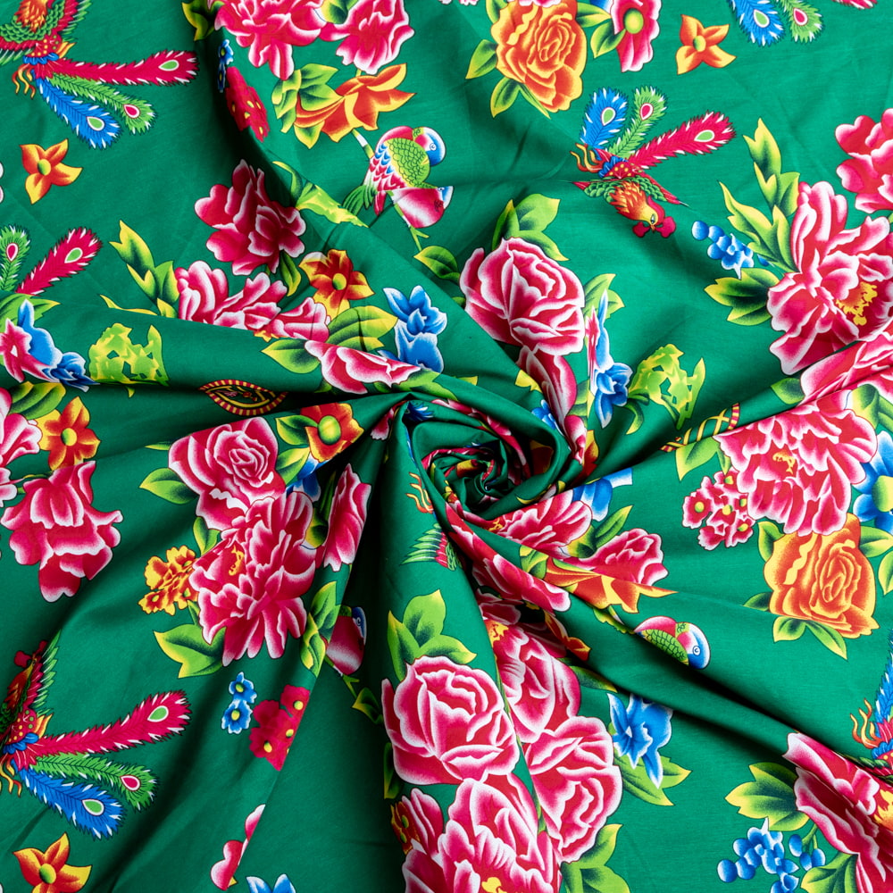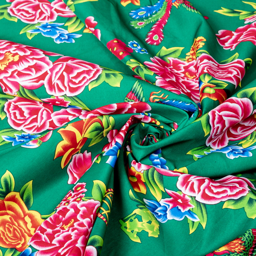 【3個セット】〔1m単位切り売り〕アジアのレトロ花柄ファブリック 生地 東北大花布 鳳凰牡丹 花鳥画 ヴィンテージ風 昭和レトロ〔約160cm〕 - グリーン 通販店