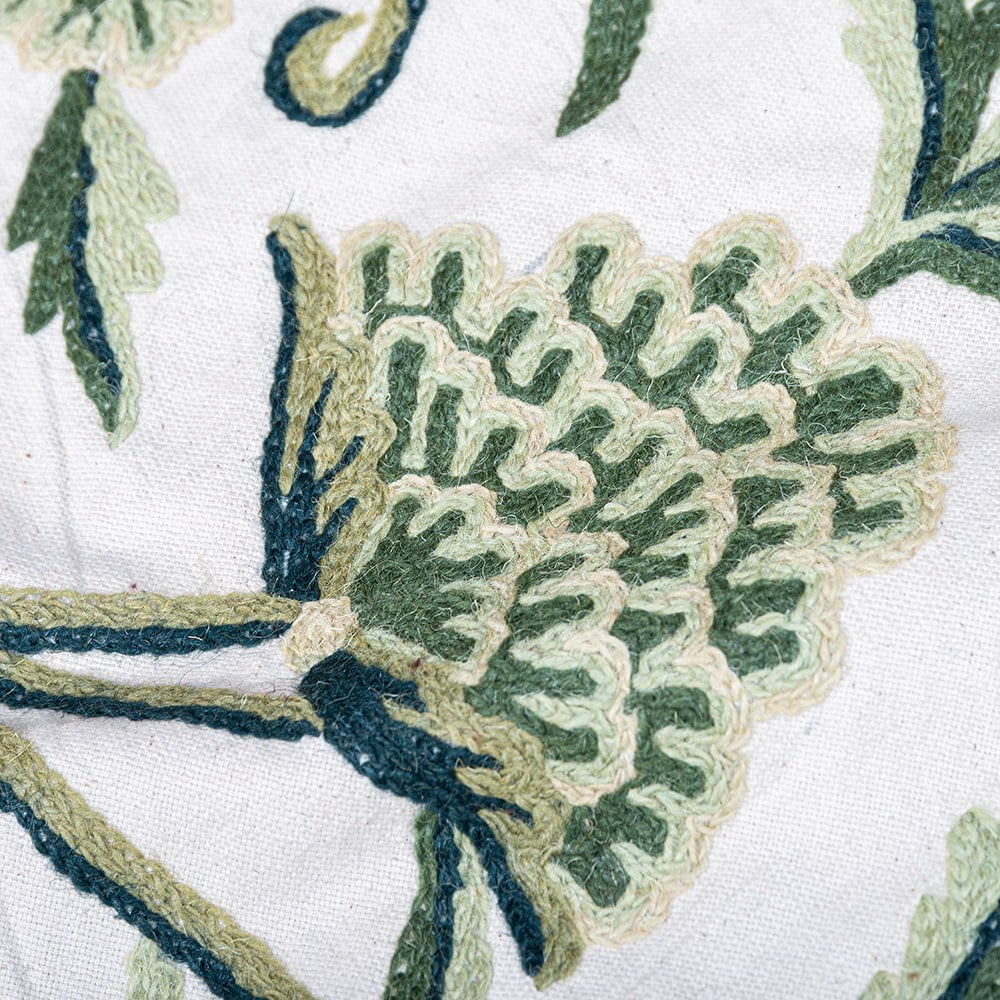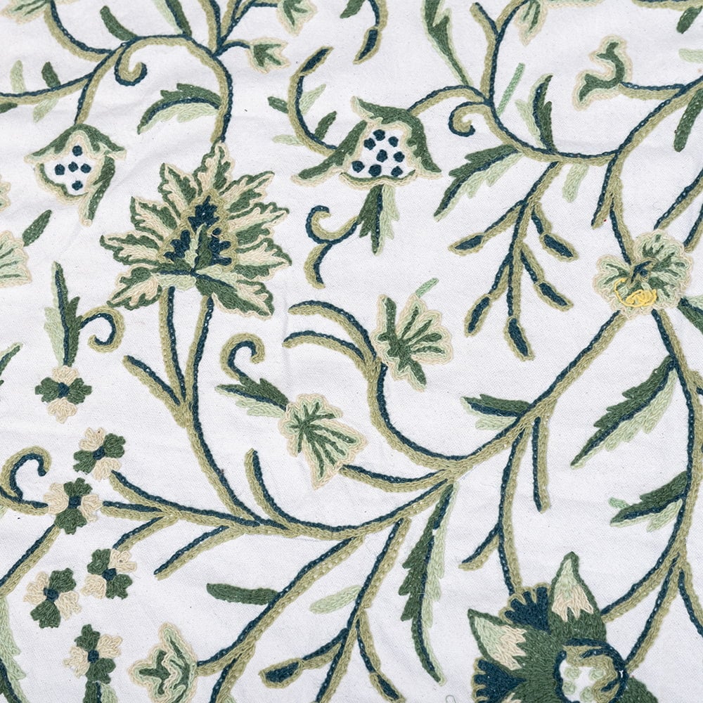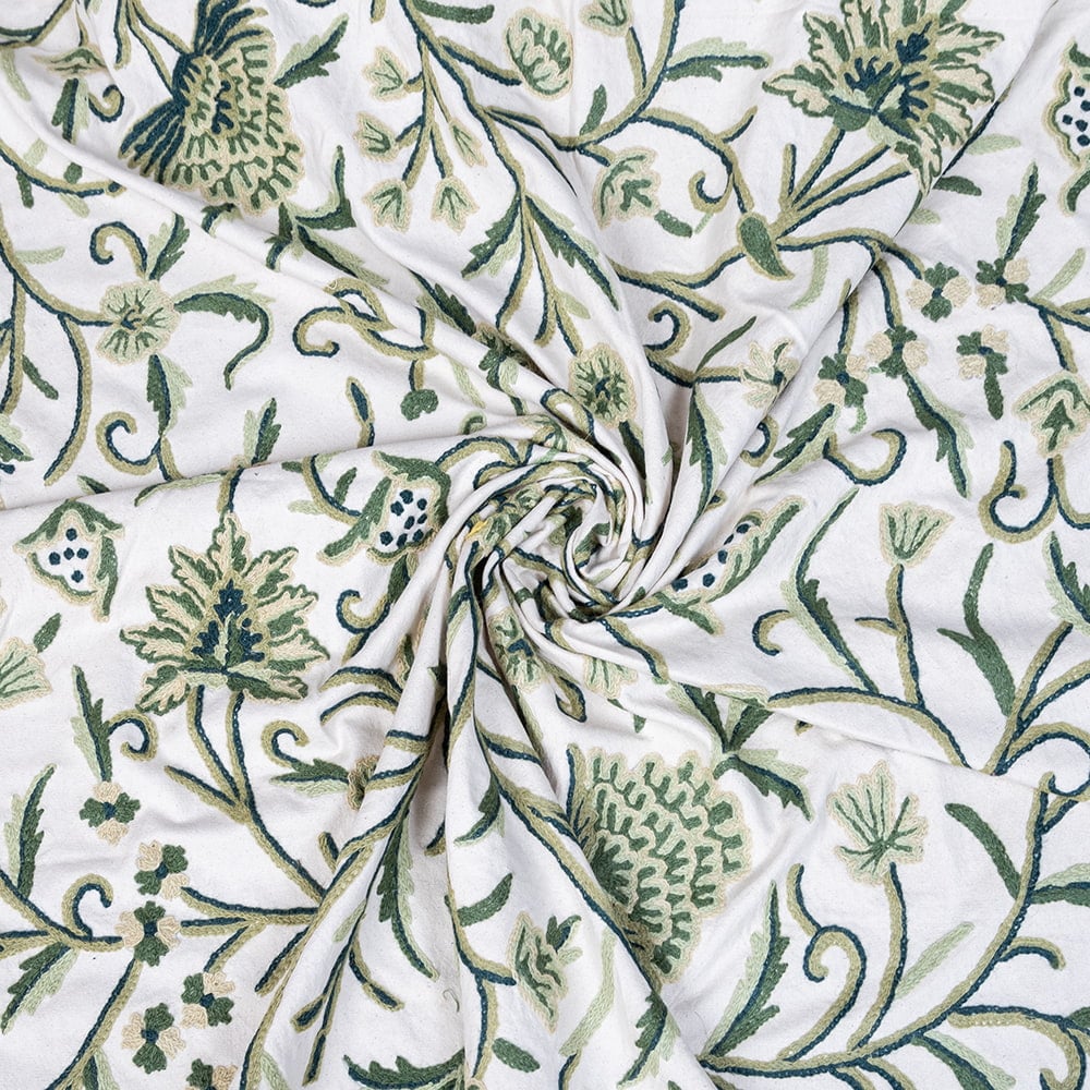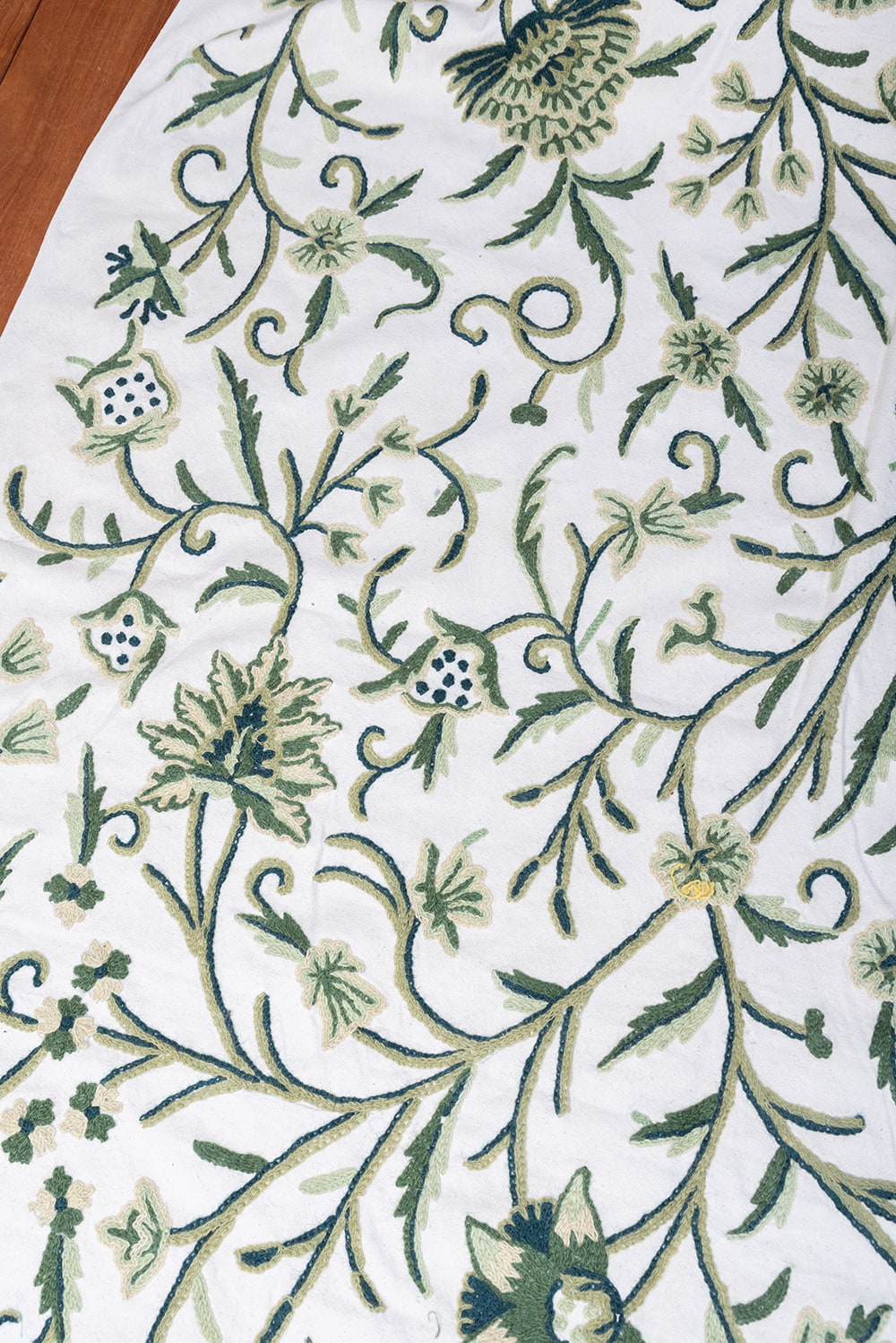 カシミールに古くから伝わる、伝統刺繍であるアーリ刺繍の生地です。特徴的なのが、刺繍糸にウール糸に用いること。ウールは柔らかく暖かみのある質感を持ち、刺繍に豊かな風合いが生まれます。ウールの色合いも優しく、とても良い雰囲気に仕上がっています。近年では、アーリ刺繍をモチーフとした機械織りの量産品もありますが、手作りのこちらとは風合いが全く異なります。職人が、ひと針ずつ丁寧に縫うので、時間がかかり高価な生地ですが、 本物のアーリ刺繍独自の風合いには価値があります。