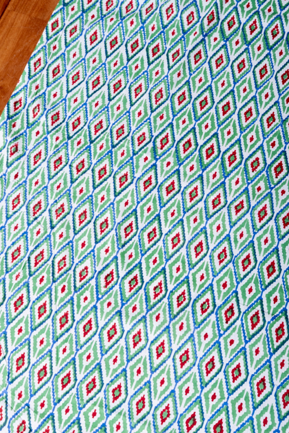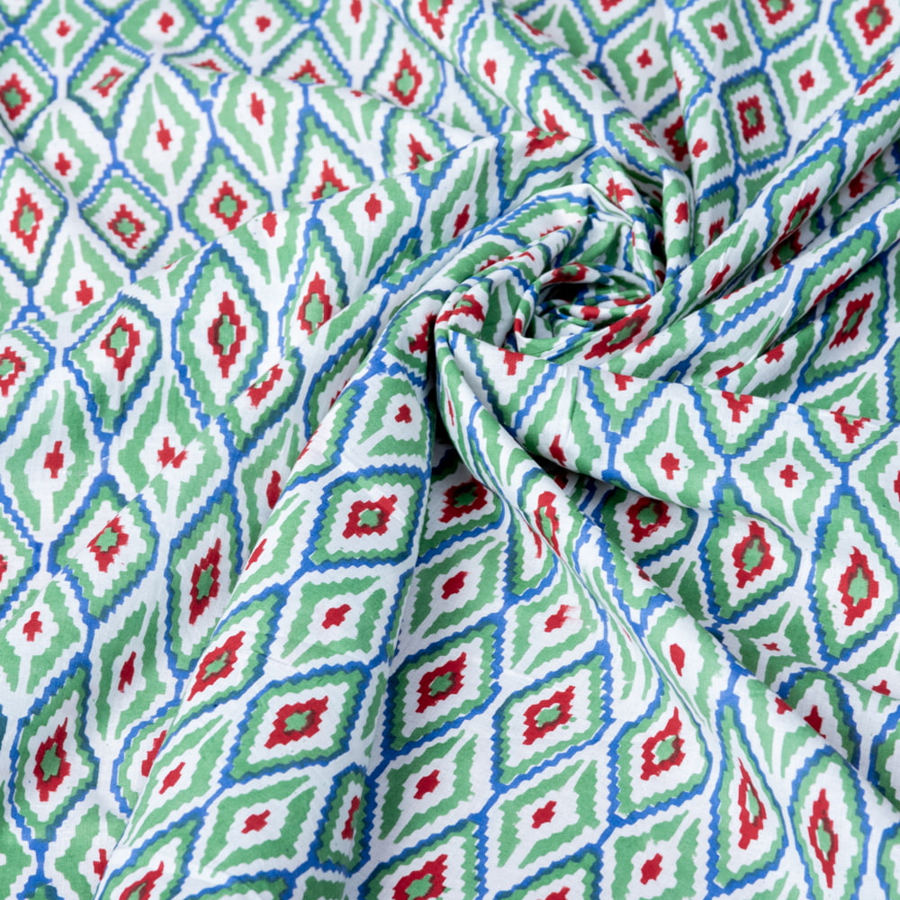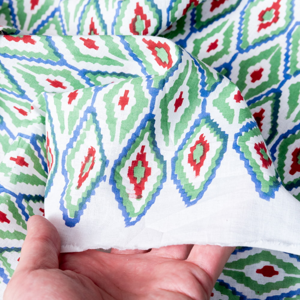 とってもかわいい生地がジャイプルからやってきました。イカットとは、絣(かすり)織のことです。縦糸と横糸をあらかじめ決まった模様に染色し、その順番に沿って織って行きます。あらかじめ、糸の長さを計算して染めて織っていく技法です。柄が滲んだような独特な風合いがあり、人気なのですが、そんなイカット風のデザインを木版を用いて表現した、ウッドブックプリントの生地です。イカットとはまた風合いが異なり、とてもかわいい雰囲気に仕上がっています。