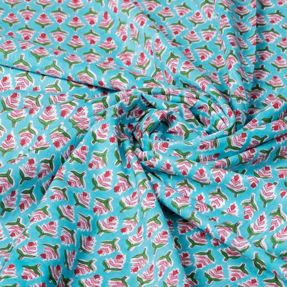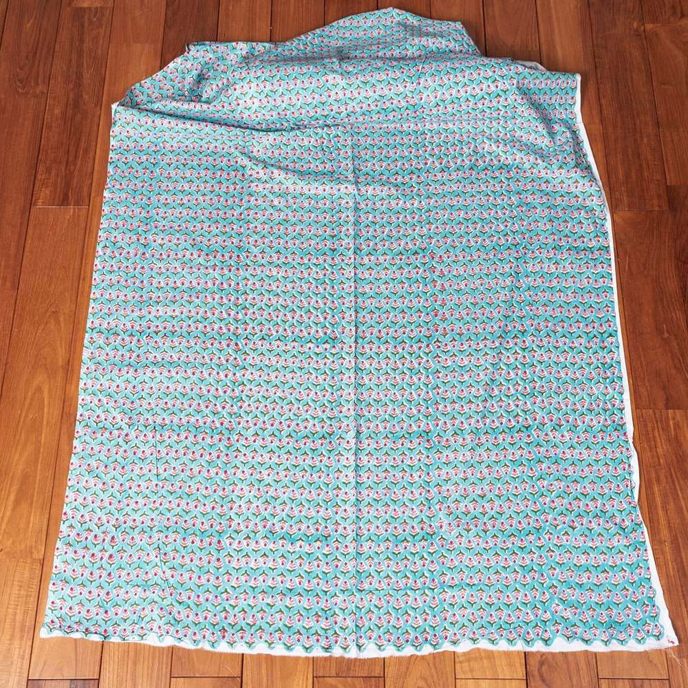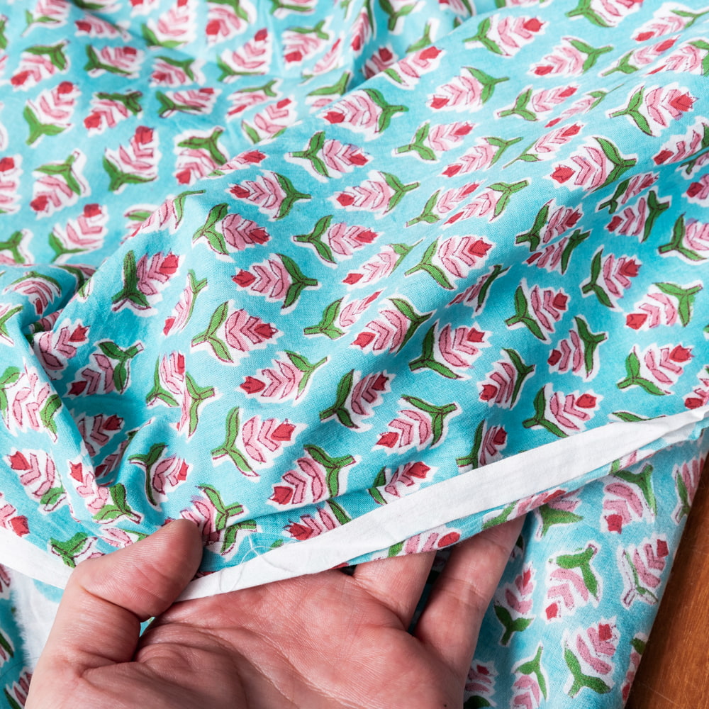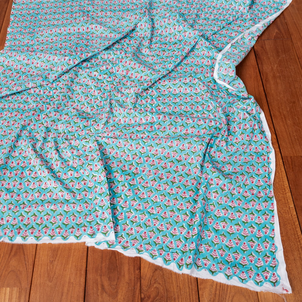 〔1m単位切り売り〕ジャイプル 職人手作り木版染め 色彩美しいボタニカルデザイン おしゃれ 生地 花柄 テーブルクロス 刺繍素材などへ〔幅約105cm〕 - 青緑系 x 3個