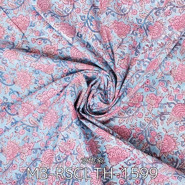 【お得な3個セット アソート】〔1m単位切り売り〕ジャイプル 職人手作り木版染め 色彩美しいボタニカルデザイン おしゃれ 生地 花柄 テーブルクロス 刺繍素材などへ〔幅約107cm〕 - 水色系の同一カテゴリ商品