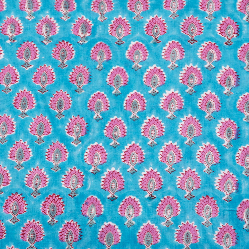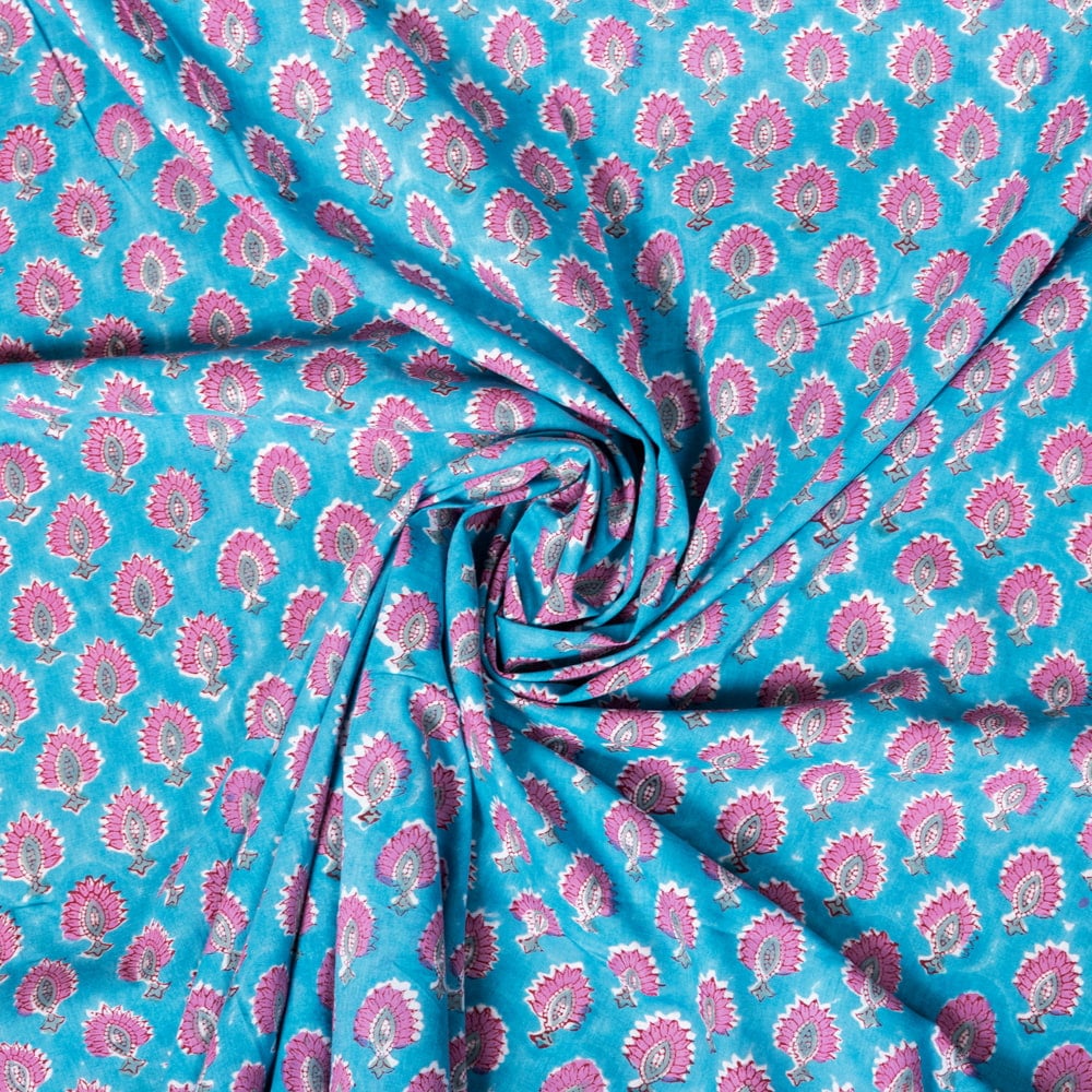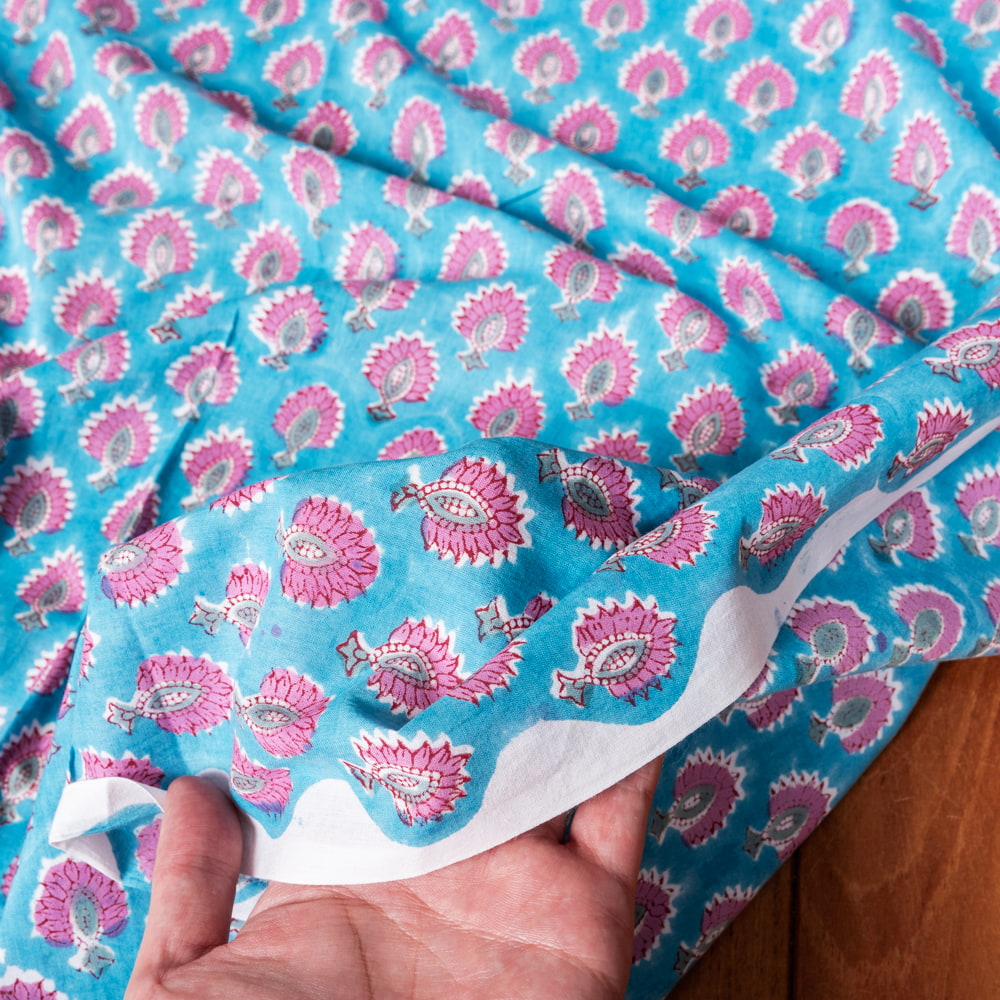 〔1m単位切り売り〕ジャイプル 職人手作り木版染め 色彩美しいボタニカルデザイン おしゃれ 生地 花柄 テーブルクロス 刺繍素材などへ〔幅約108cm〕 - ピーコックブルー系 x 3個
