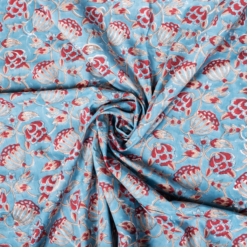 【3個セット】〔1m単位切り売り〕ジャイプル 職人手作り木版染め 色彩美しいボタニカルデザイン おしゃれ 生地 花柄 テーブルクロス 刺繍素材などへ〔幅約109cm〕 - ティールブルー系