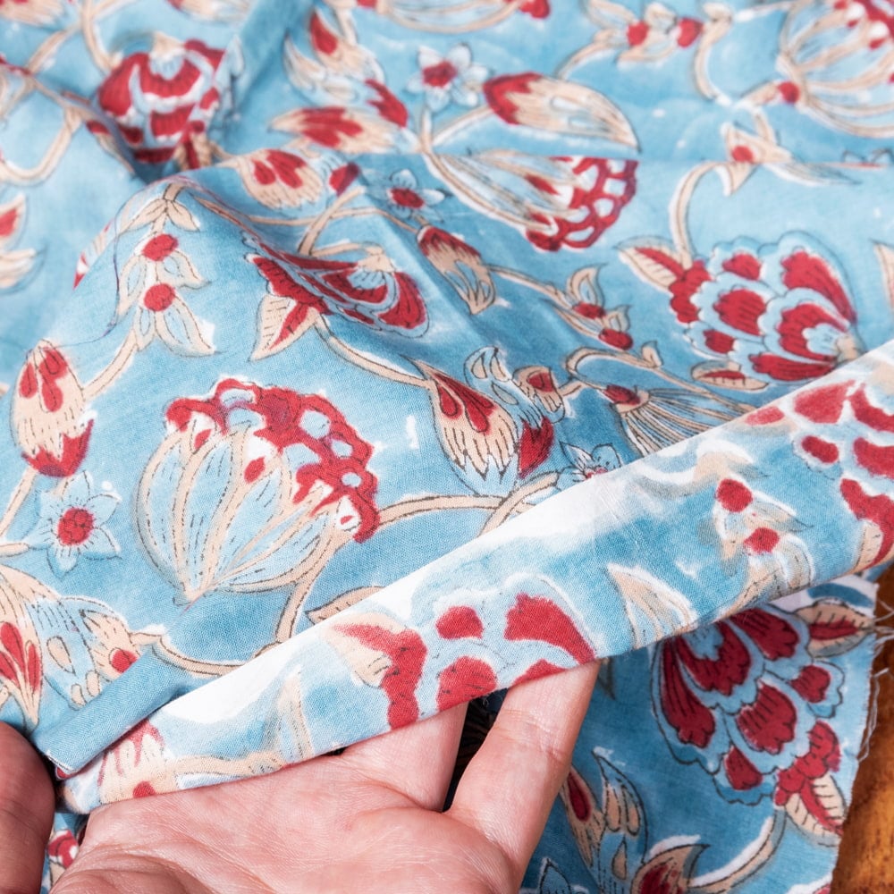 【3個セット】〔1m単位切り売り〕ジャイプル 職人手作り木版染め 色彩美しいボタニカルデザイン おしゃれ 生地 花柄 テーブルクロス 刺繍素材などへ〔幅約109cm〕 - ティールブルー系の同一カテゴリ商品