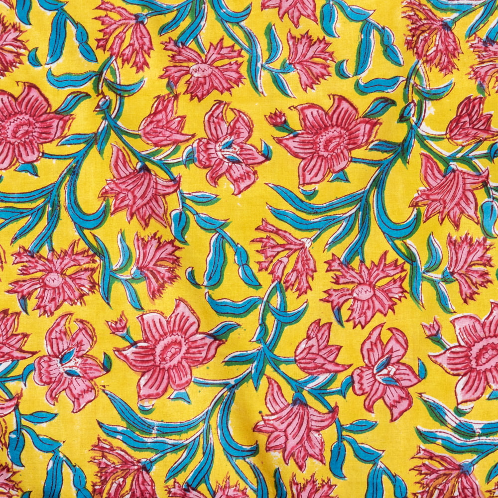 〔1m単位切り売り〕ジャイプル 職人手作り木版染め 色彩美しいボタニカルデザイン おしゃれ 生地 花柄 テーブルクロス 刺繍素材などへ〔幅約110cm〕 - イエロー系 x 3個