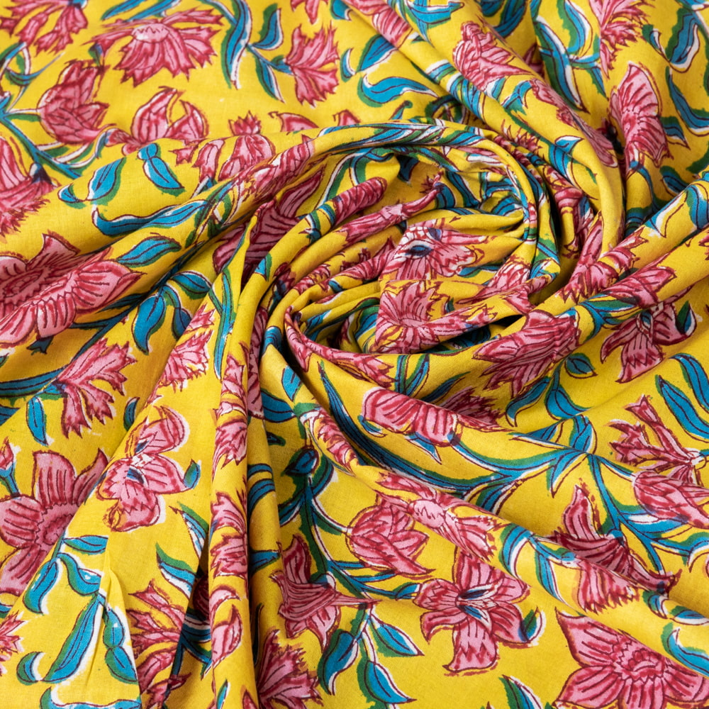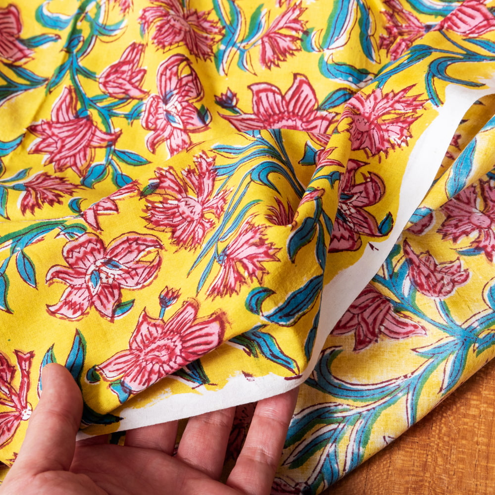 【3個セット】〔1m単位切り売り〕ジャイプル 職人手作り木版染め 色彩美しいボタニカルデザイン おしゃれ 生地 花柄 テーブルクロス 刺繍素材などへ〔幅約110cm〕 - イエロー系の同一カテゴリ商品