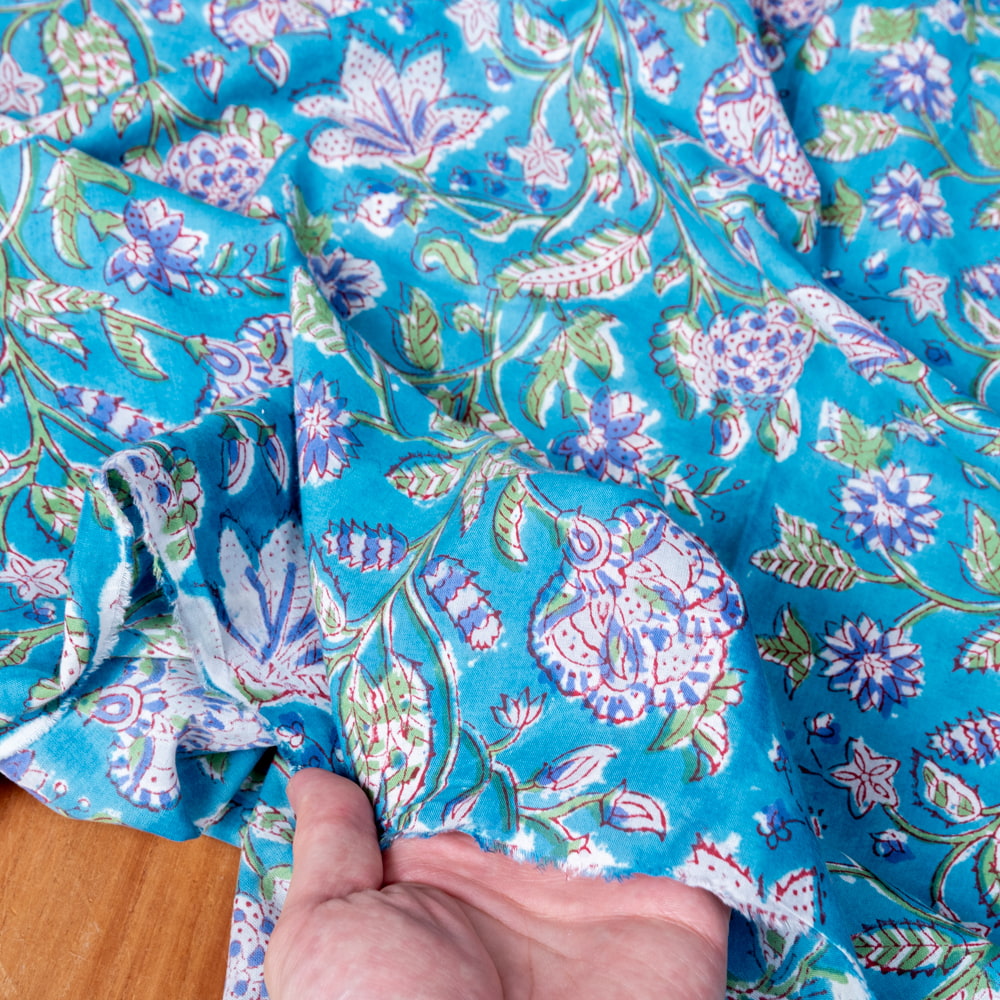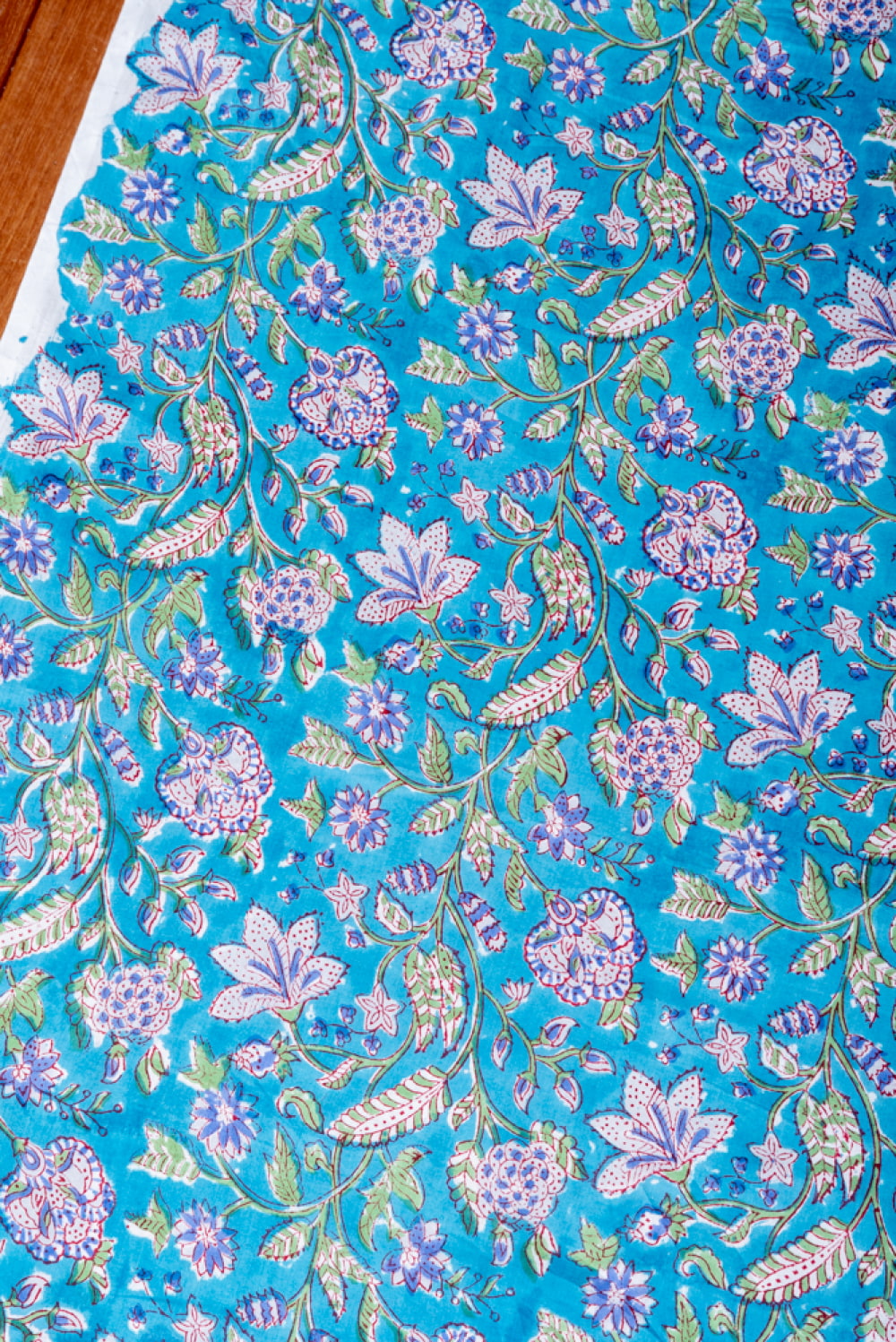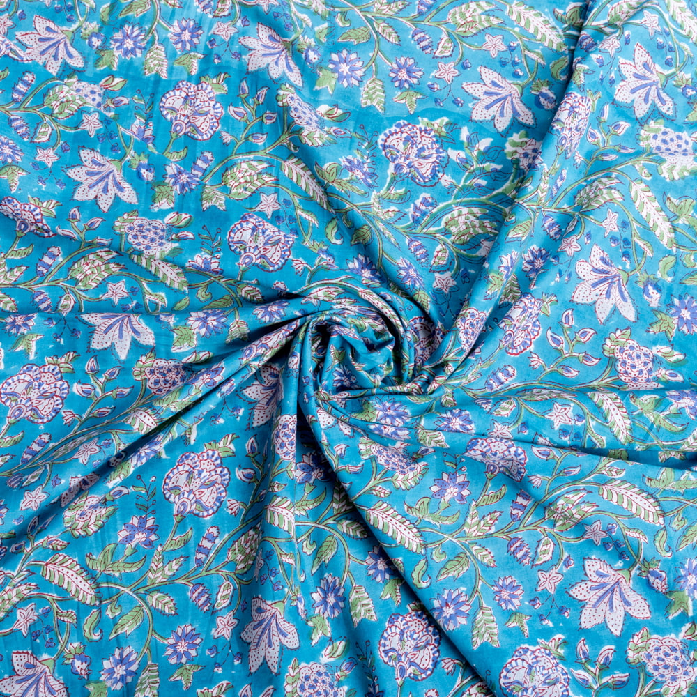 〔1m単位切り売り〕ジャイプル 職人手作り木版染め 色彩美しいボタニカルデザイン おしゃれ 生地 花柄 テーブルクロス 刺繍素材などへ〔幅約110cm〕 - ブルー系 x 3個