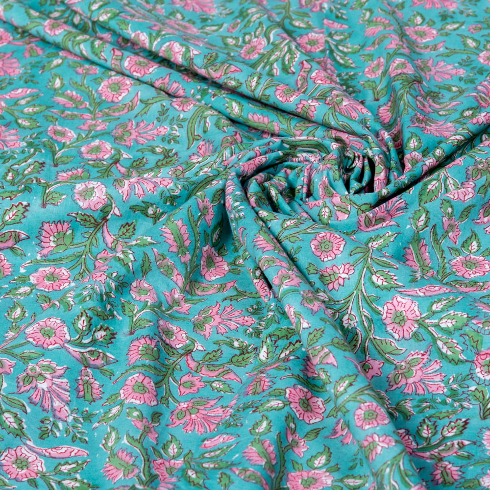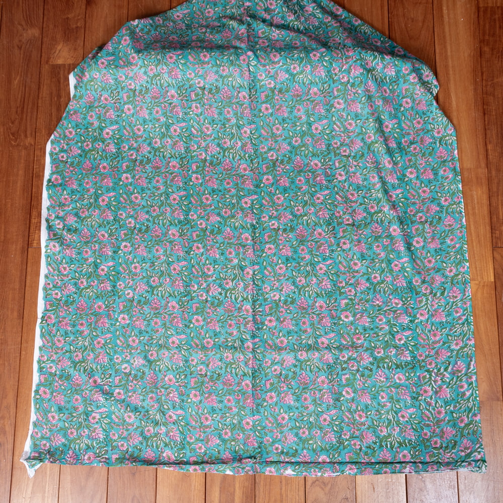 〔1m単位切り売り〕ジャイプル 職人手作り木版染め 色彩美しいボタニカルデザイン おしゃれ 生地 花柄 テーブルクロス 刺繍素材などへ〔幅約111cm〕 - グリーン系 x 3個