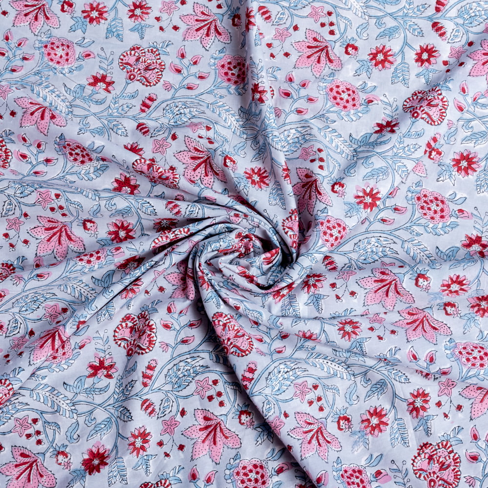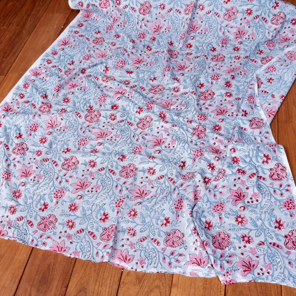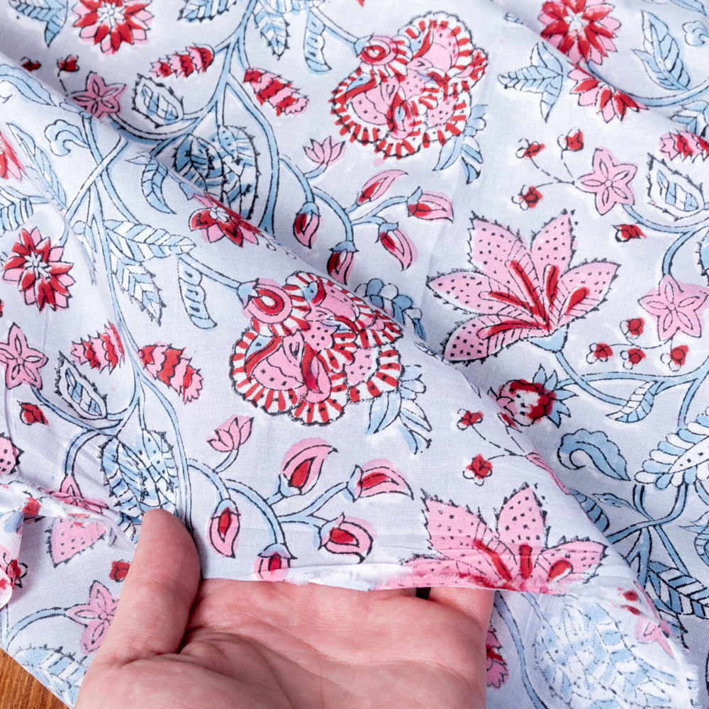 とってもかわいい生地がジャイプルからやってきました。どこかプロヴァンスなテイストも感じさせる、魅力的な色彩とデザイン。職人さんが全て手作りしており、インドらしい木版と鮮やかな色彩がきわだつ、インド綿100%のファブリックです。ナチュラルな風合いは、派手すぎずほどよく上品な雰囲気で、どんなお部屋にも馴染み、相性良くフィットしてくれそうです。