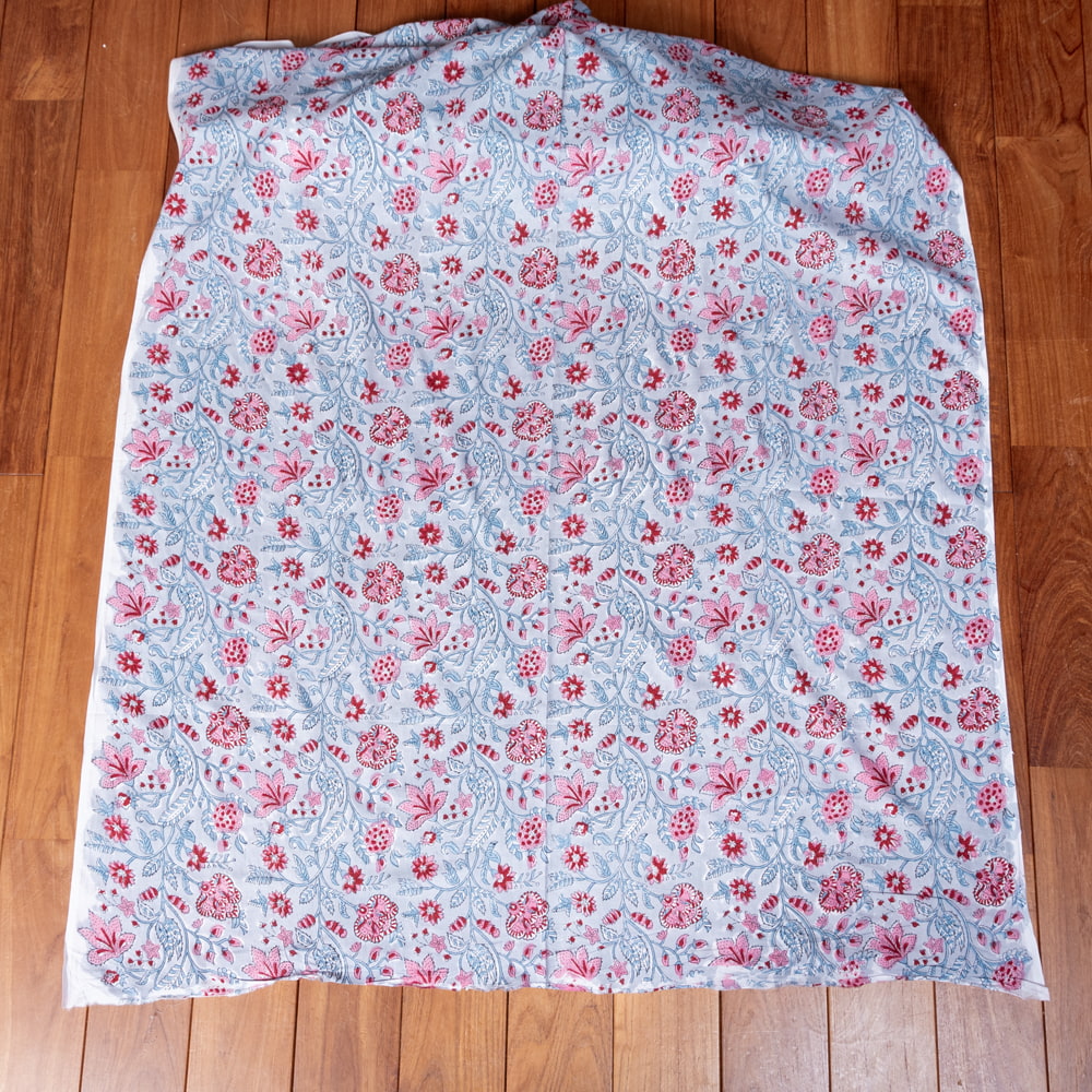 木版染めとは、ウッドブロック(木版)を用いて一つ一つ模様を染めこんだ優雅で贅沢な仕上がりの布です。大量生産には向かない、非常に時間のかかる丁寧な手仕事の賜物といえます。インドは美しい布の宝庫ですが、その中でも特に素敵な一枚に仕上がっています。ハンドメイドのウッドブロックプリントにしか出せない、独特のムラがありとても雰囲気があります。