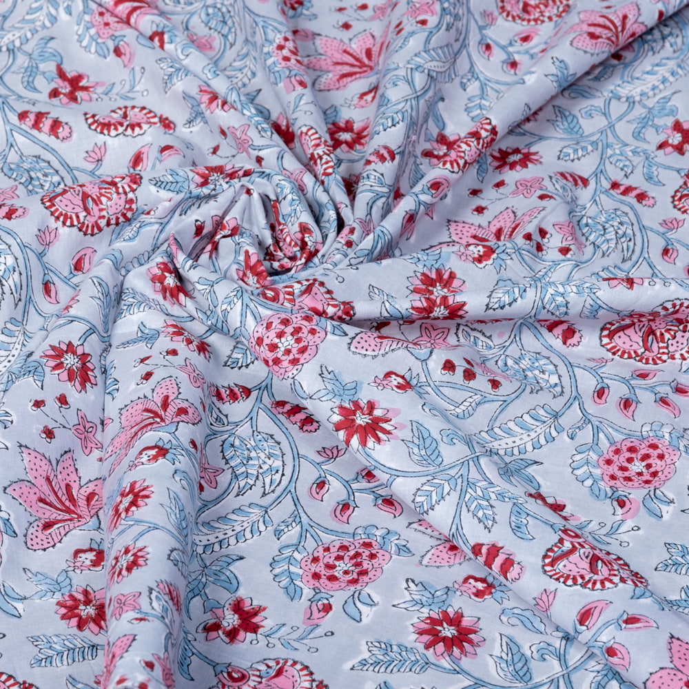〔1m単位切り売り〕ジャイプル 職人手作り木版染め 色彩美しいボタニカルデザイン おしゃれ 生地 花柄 テーブルクロス 刺繍素材などへ〔幅約111cm〕 - グレー系 x 3個