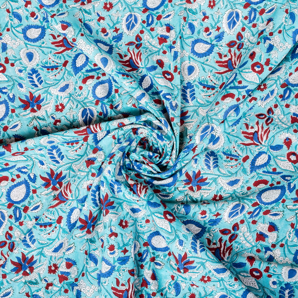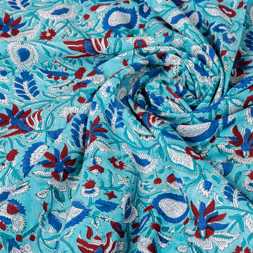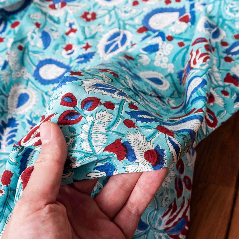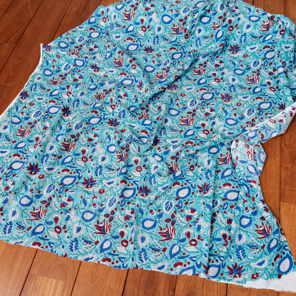 〔1m単位切り売り〕ジャイプル 職人手作り木版染め 色彩美しいボタニカルデザイン おしゃれ 生地 花柄 テーブルクロス 刺繍素材などへ〔幅約111cm〕 - ブルーグリーン系 x 3個