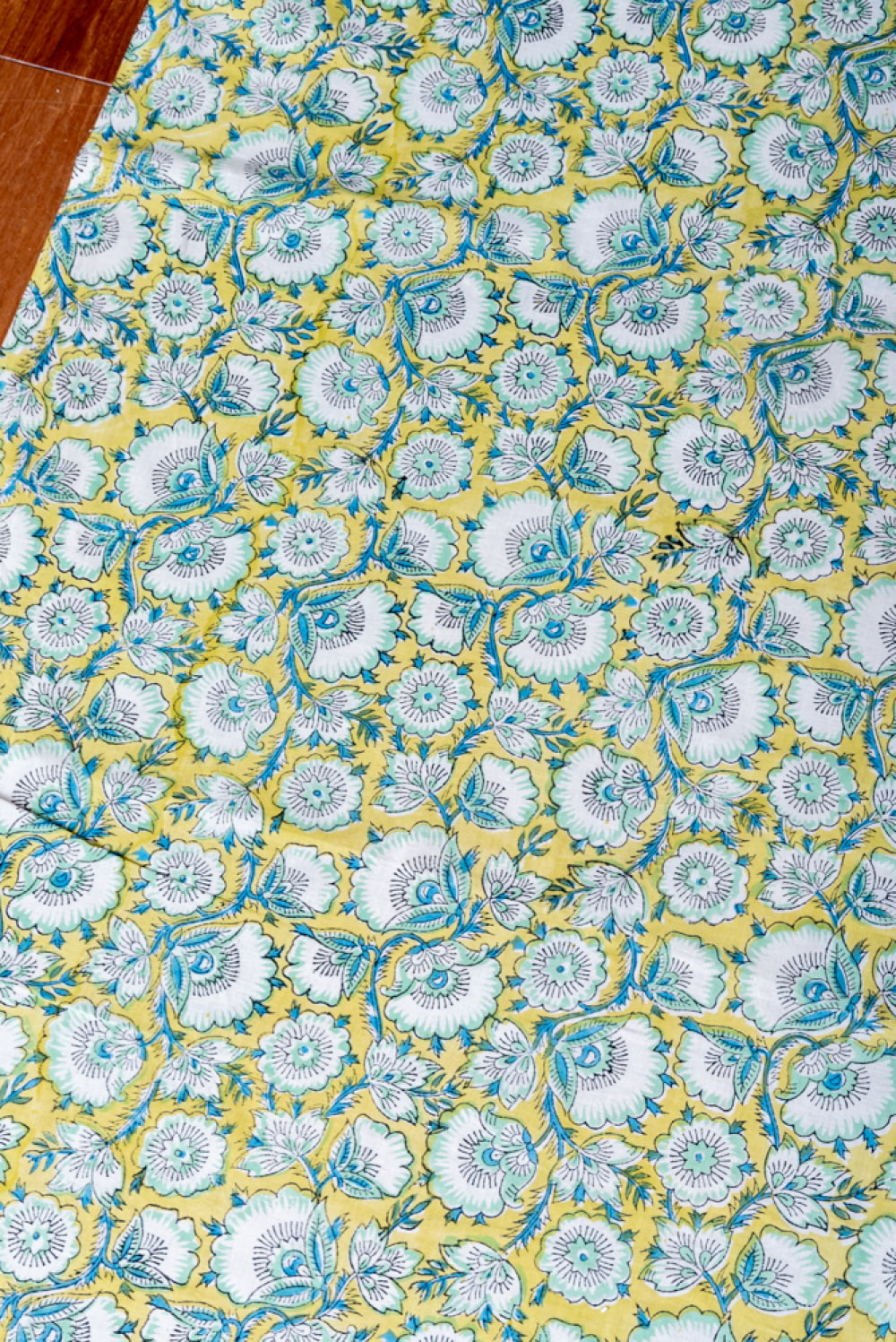 木版染めとは、ウッドブロック(木版)を用いて一つ一つ模様を染めこんだ優雅で贅沢な仕上がりの布です。大量生産には向かない、非常に時間のかかる丁寧な手仕事の賜物といえます。インドは美しい布の宝庫ですが、その中でも特に素敵な一枚に仕上がっています。ハンドメイドのウッドブロックプリントにしか出せない、独特のムラがありとても雰囲気があります。
