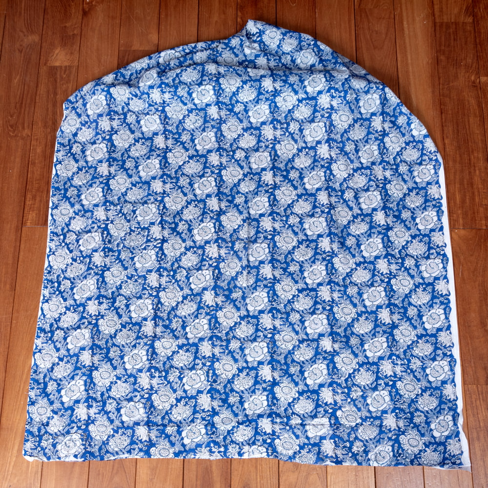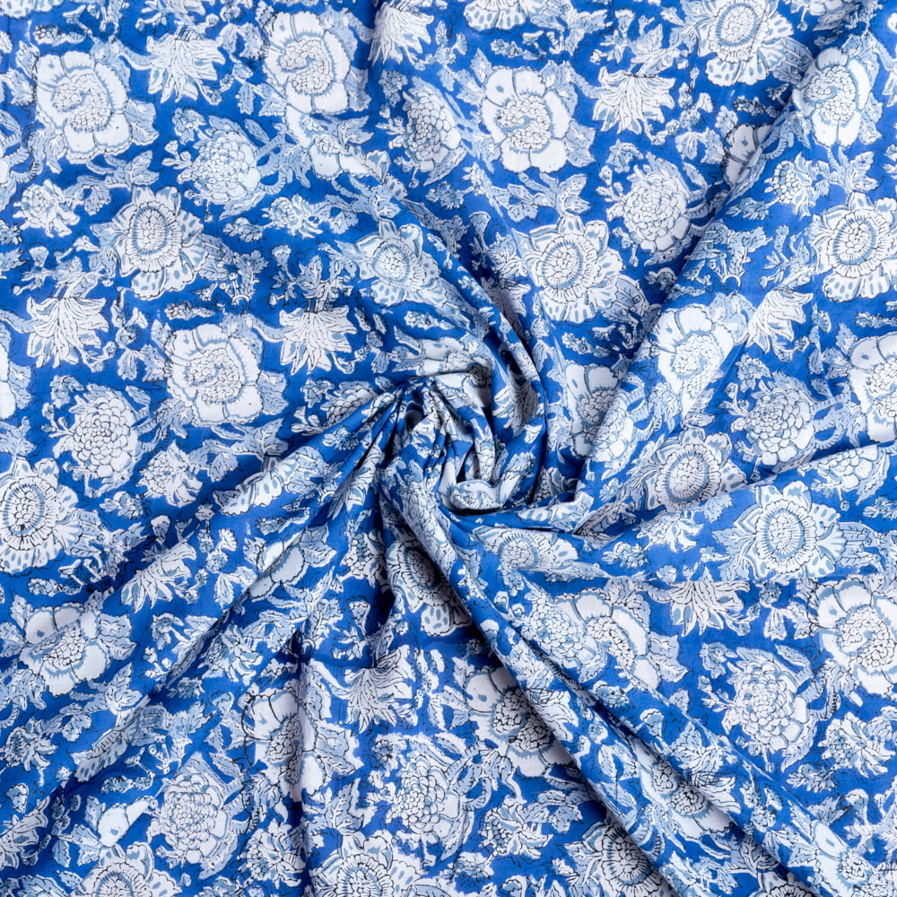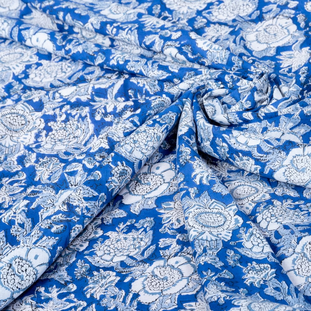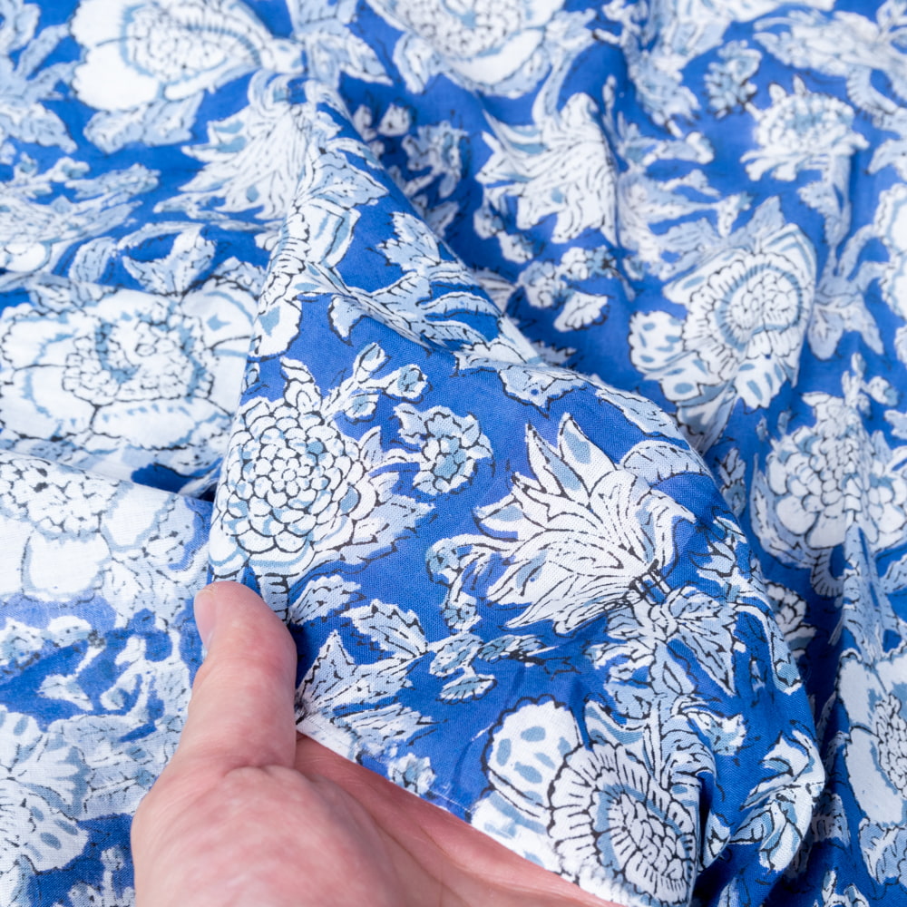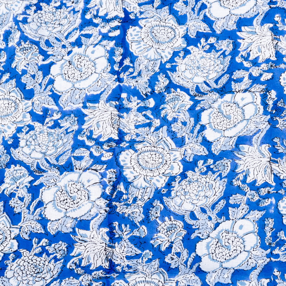 〔1m単位切り売り〕ジャイプル 職人手作り木版染め 色彩美しいボタニカルデザイン おしゃれ 生地 花柄 テーブルクロス 刺繍素材などへ〔幅約113cm〕 - ブルー 系 x 3個
