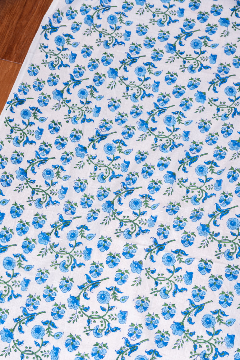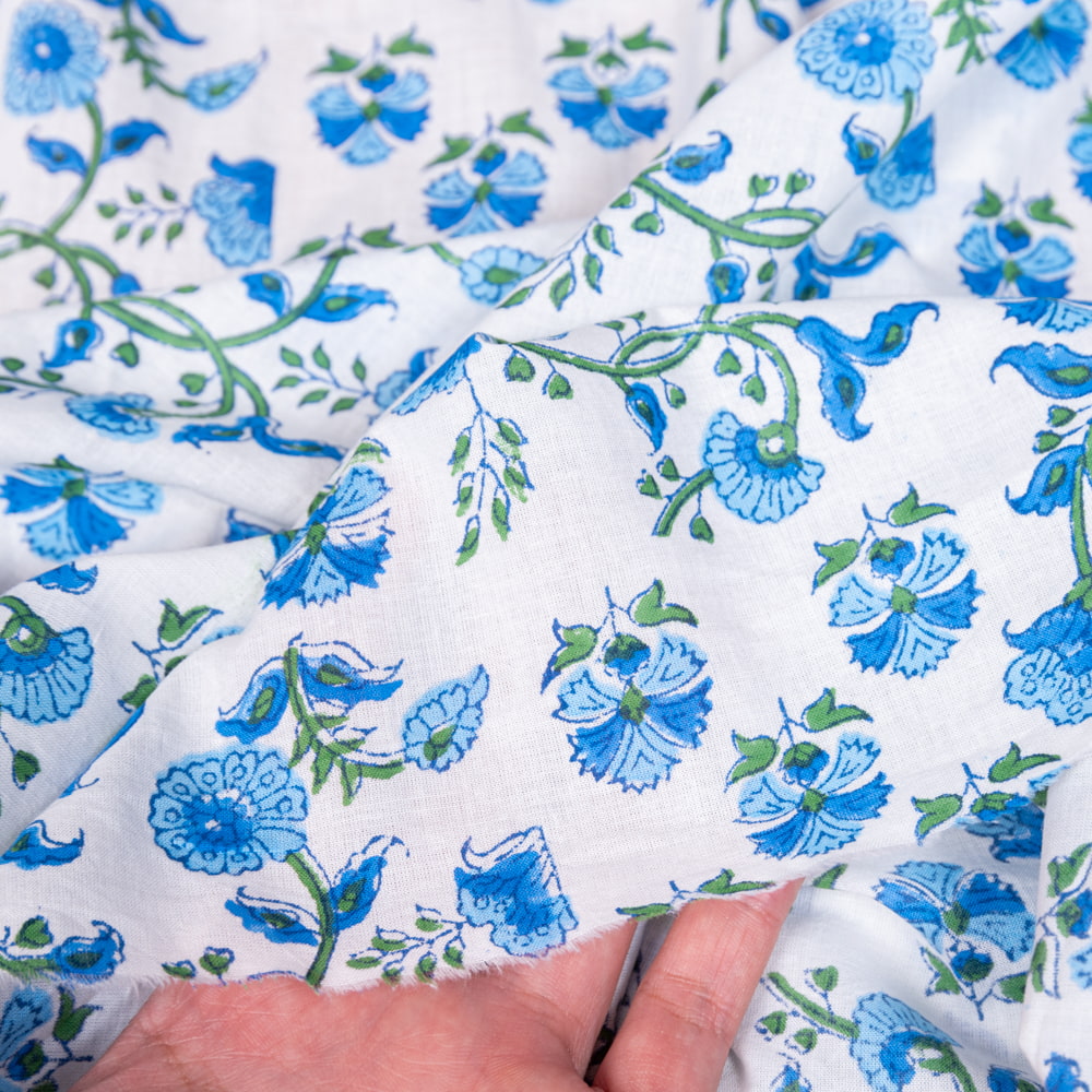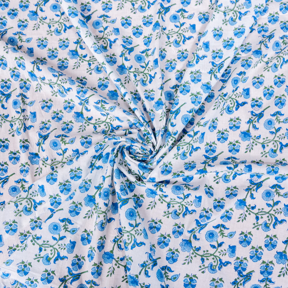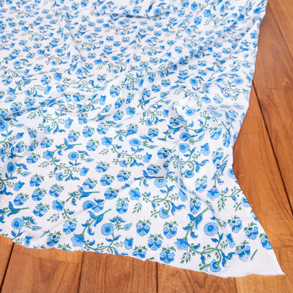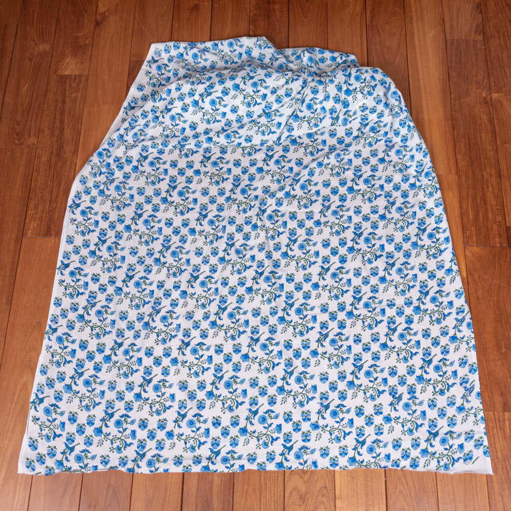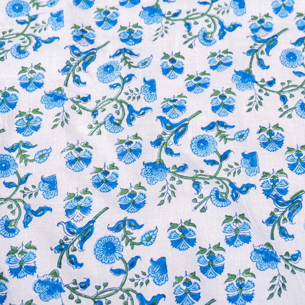 〔1m単位切り売り〕ジャイプル 職人手作り木版染め 色彩美しいボタニカルデザイン おしゃれ 生地 花柄 テーブルクロス 刺繍素材などへ〔幅約113cm〕 - ブルー×ホワイト系 x 3個