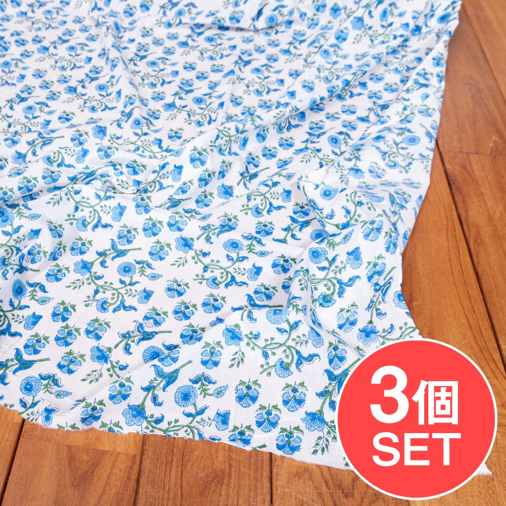 【3個セット】〔1m単位切り売り〕ジャイプル 職人手作り木版染め 色彩美しいボタニカルデザイン おしゃれ 生地 花柄 テーブルクロス 刺繍素材などへ〔幅約113cm〕 - ブルー×ホワイト系