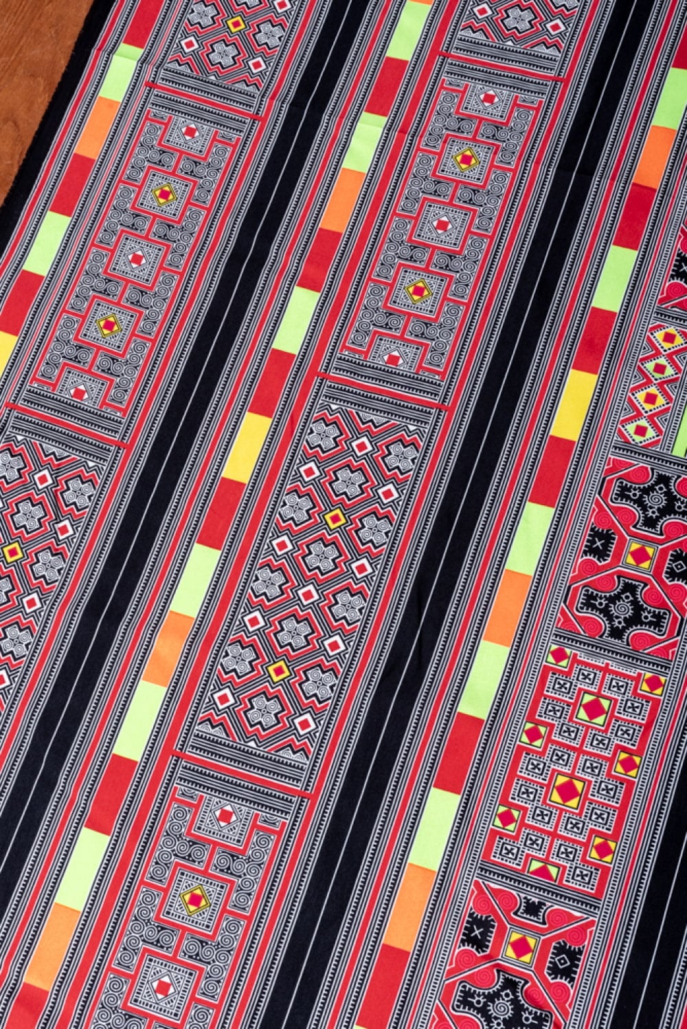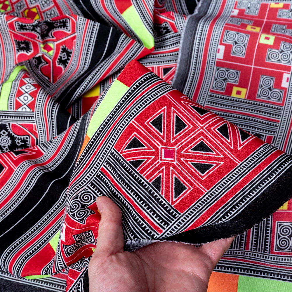 ベトナムの市場で見つけてきたモン族柄を、鮮やかにプリントした布です。ベトナムのモン族の伝統的な文化からインスパイアされた美しい柄と、昇華転写の技術が合わさっています。昇華転写プリントは、生地にインクを染み込ませる特殊な技術で、鮮やかな色彩と解像度の高さが魅力です。モン族の細かい刺繍の表現と、色鮮やかさの表現するのに適した手法ですね。ちょっと遠くからみると、結構リアルで刺繍風に見えます。