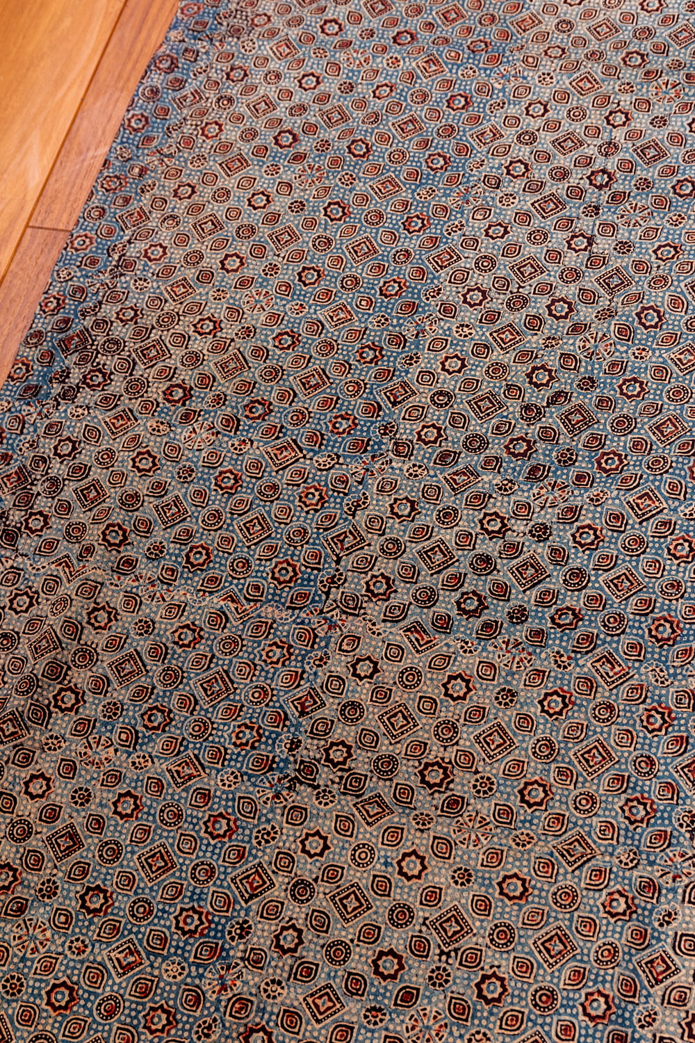 ウッドブロック(木版)を用いて一つ一つ模様を染めこんだ優雅で贅沢な仕上がりの布です。色が変わるたびに版を交換するため非常に時間のかかる丁寧な手仕事の賜物といえます。インドは美しい布の宝庫ですが、その中でも特に素敵な一枚に仕上がっています。