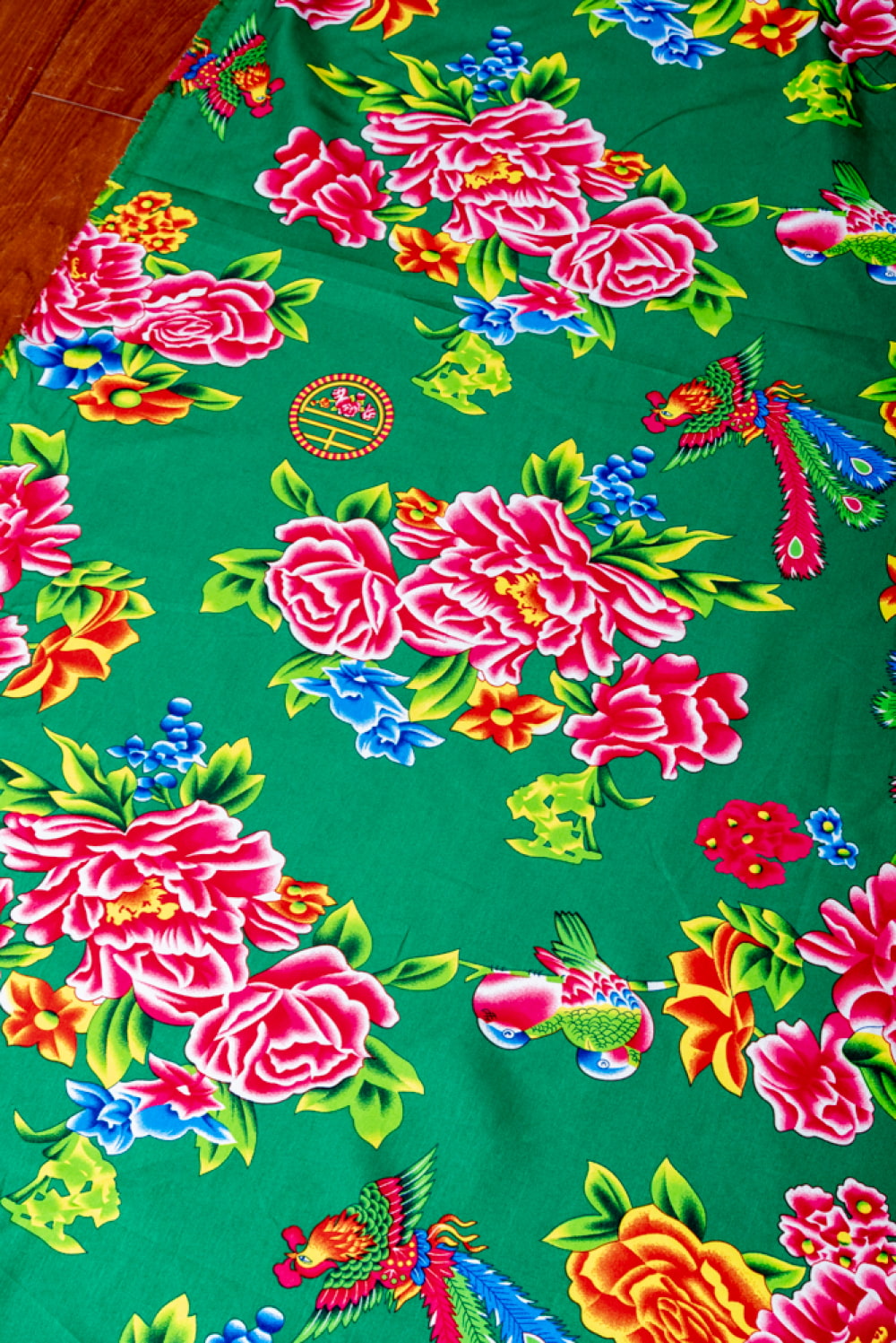 【5個セット】〔1m単位切り売り〕アジアのレトロ花柄ファブリック 生地 東北大花布 鳳凰牡丹 花鳥画 ヴィンテージ風 昭和レトロ〔約160cm〕 - グリーン
