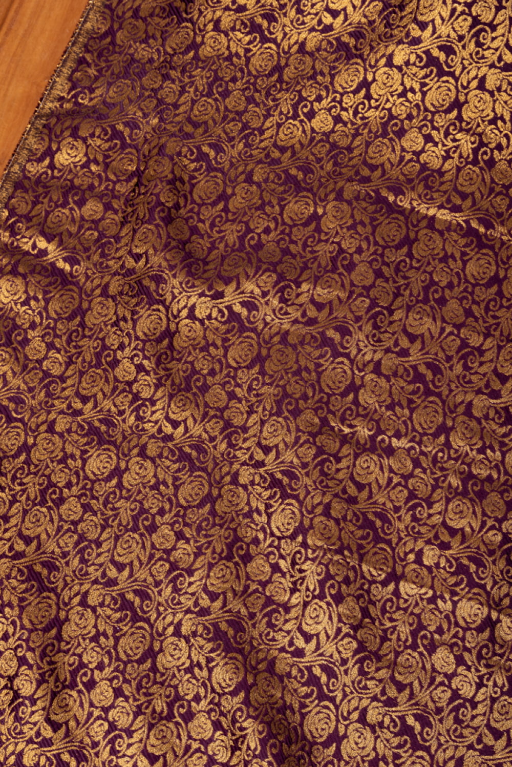 【5個セット】〔1m単位切り売り〕インドの伝統模様布 光沢感のあるブロケード生地 金糸〔約120cm〕パープル系の商品写真 6枚目 陰影があるとこのような感じになります