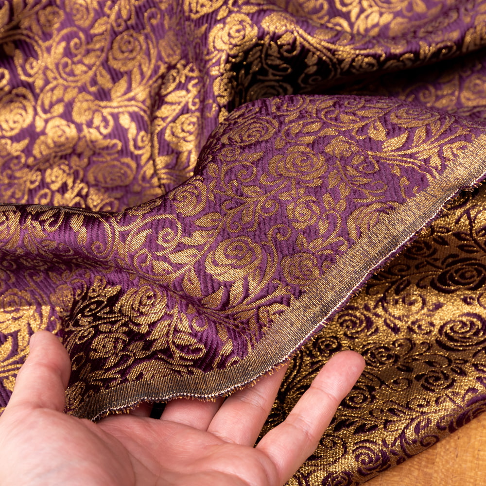 【5個セット】〔1m単位切り売り〕インドの伝統模様布 光沢感のあるブロケード生地 金糸〔約120cm〕パープル系の商品写真 2枚目 とても雰囲気のある、インドからやって来た切り売りの生地です。