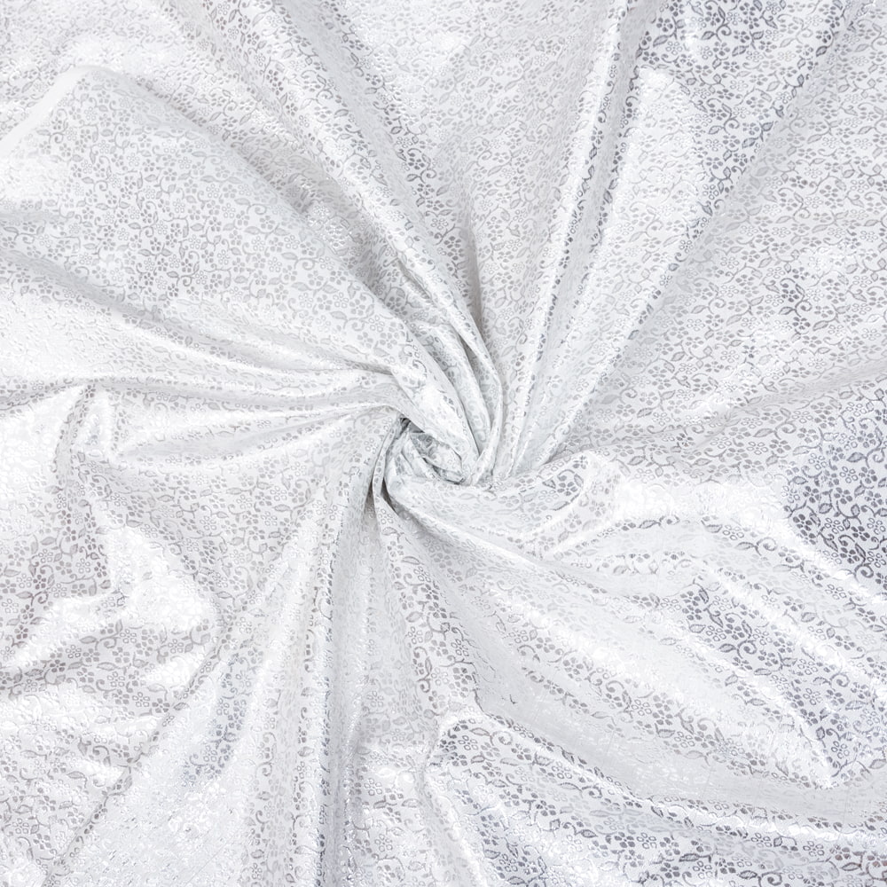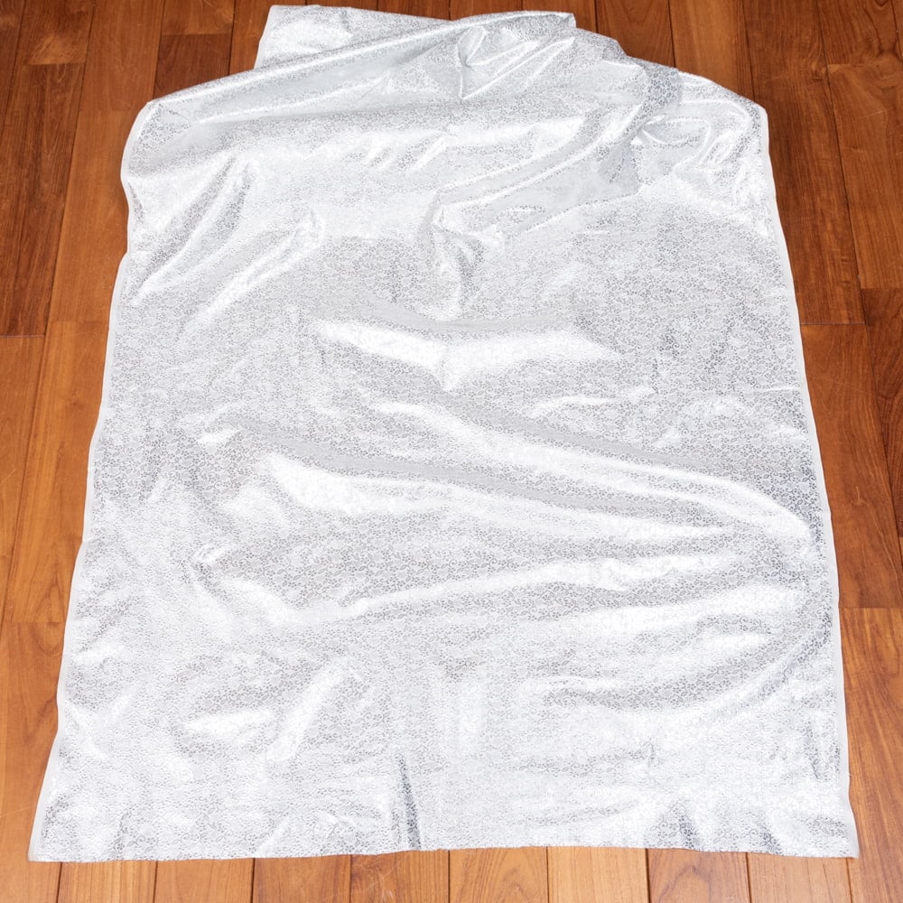 伝統的な紋様と、光沢感あるホワイトの生地がマッチングした素敵な布です。手芸用の布としてはもちろんインテリア用のカバーや飾り布として様々な場所でお使いいただけます。ソファカバーやカーテン、等々色々な使いみちが考えられますね。陰影が美しいので、オリジナルのスカーフや壁飾りにしても素敵です。