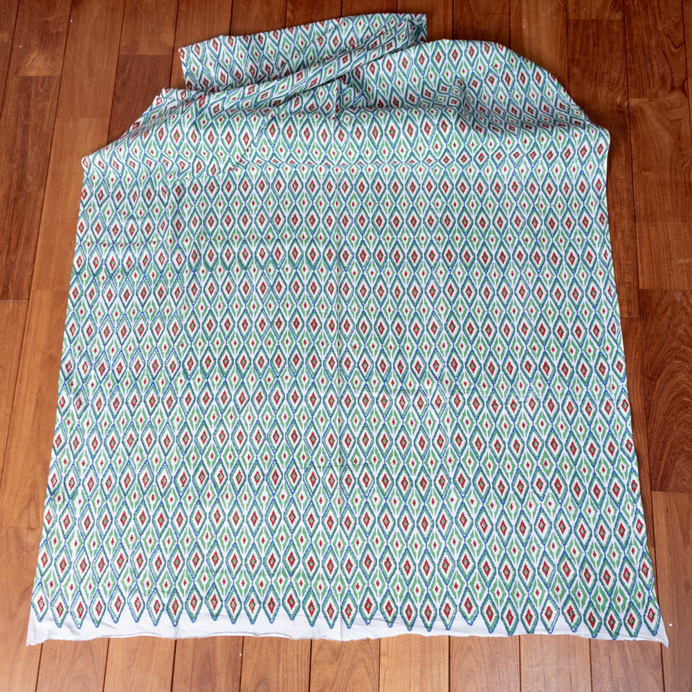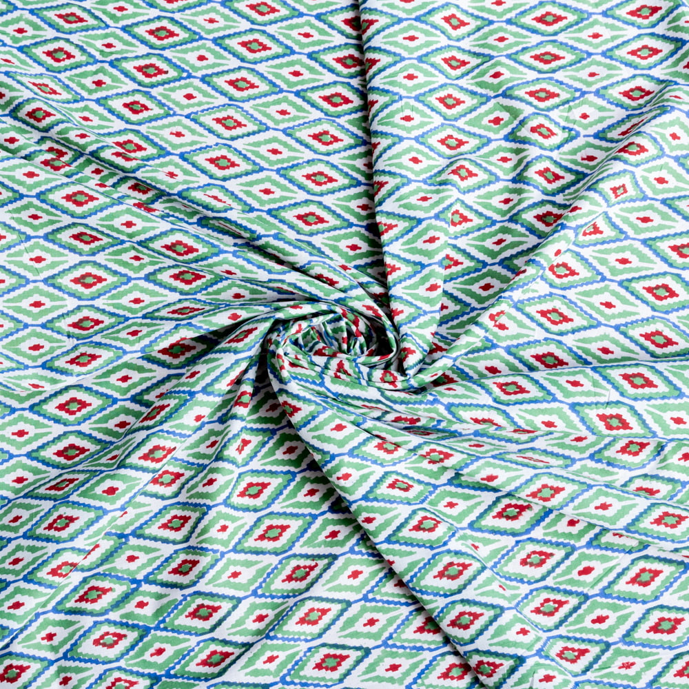 とってもかわいい生地がジャイプルからやってきました。イカットとは、絣(かすり)織のことです。縦糸と横糸をあらかじめ決まった模様に染色し、その順番に沿って織って行きます。あらかじめ、糸の長さを計算して染めて織っていく技法です。柄が滲んだような独特な風合いがあり、人気なのですが、そんなイカット風のデザインを木版を用いて表現した、ウッドブックプリントの生地です。イカットとはまた風合いが異なり、とてもかわいい雰囲気に仕上がっています。