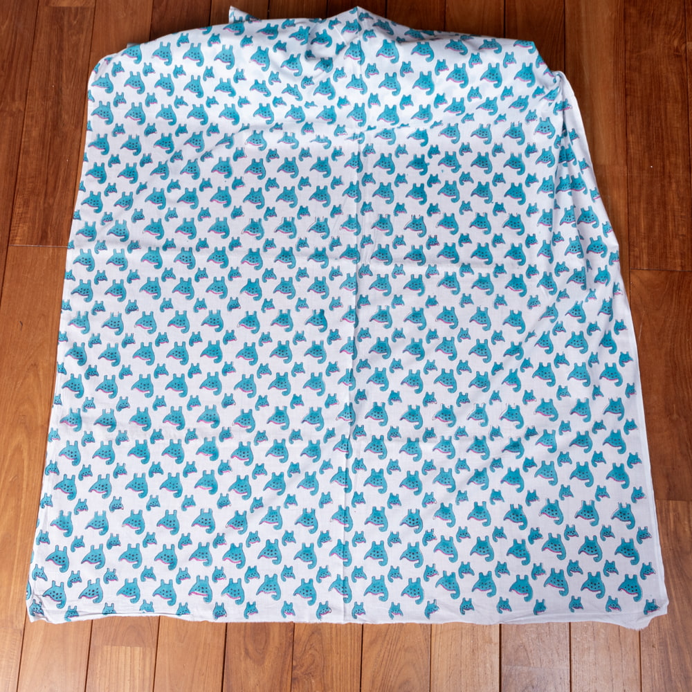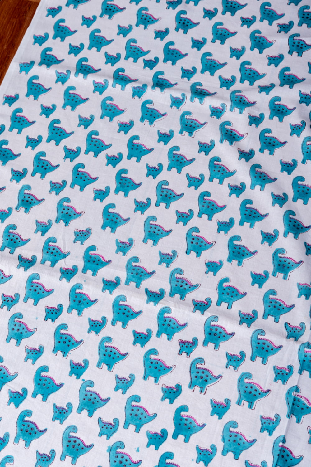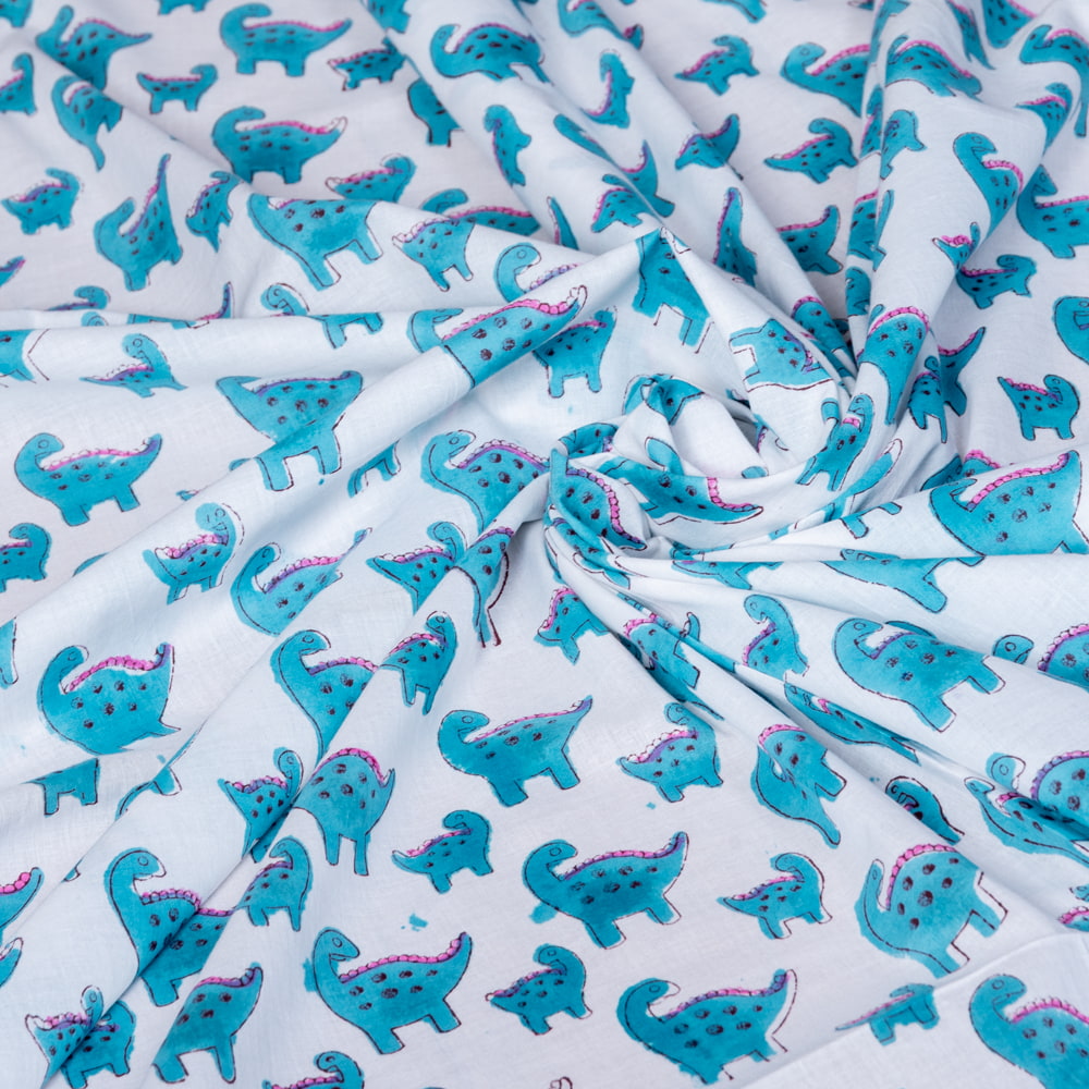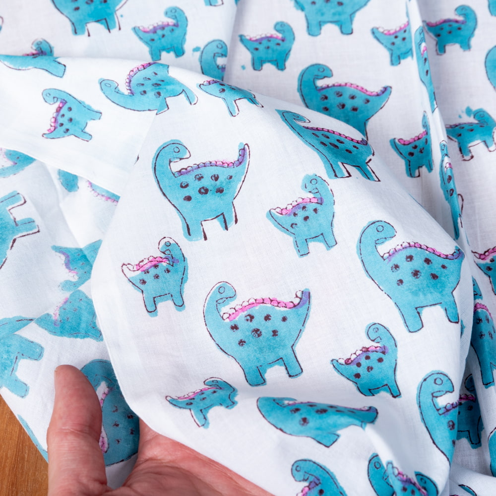 とってもかわいい生地がジャイプルからやってきました。インドらしい木版とインド綿100%のファブリックです。たまにゆるいデザインが発見されるインドですが、恐竜親子がデザインされた生地を見つけてきました。木版染めで作られているので、微妙なプリントのズレやかすれが、スクリーンプリントには出せない、特別な風合いに仕上がっています。
