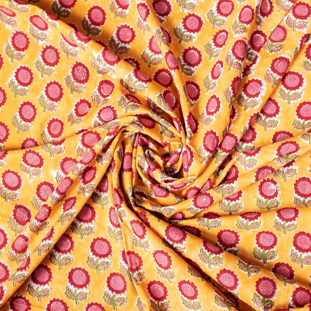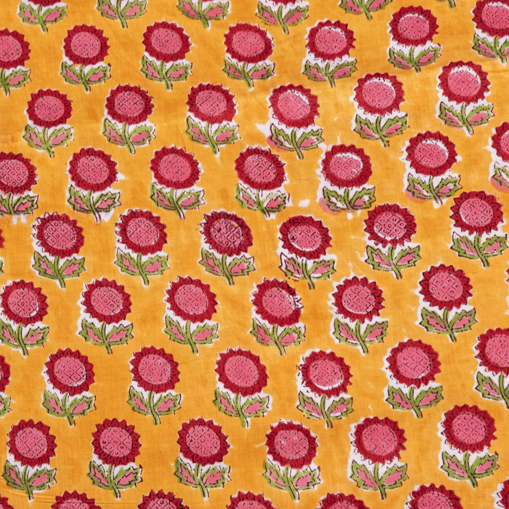 【5個セット】〔1m切単位り売り〕ジャイプル 職人手作り木版染め 色彩美しいボタニカルデザイン おしゃれ 生地 花柄 テーブルクロス 刺繍素材などへ〔幅約108cm〕 - オレンジ系