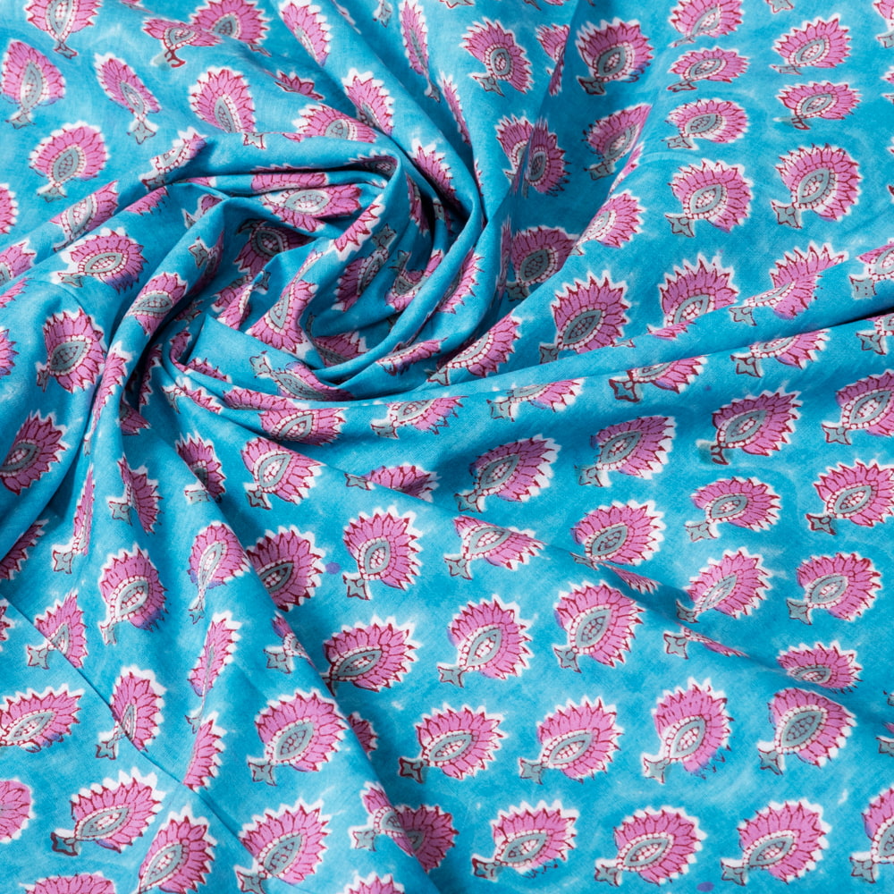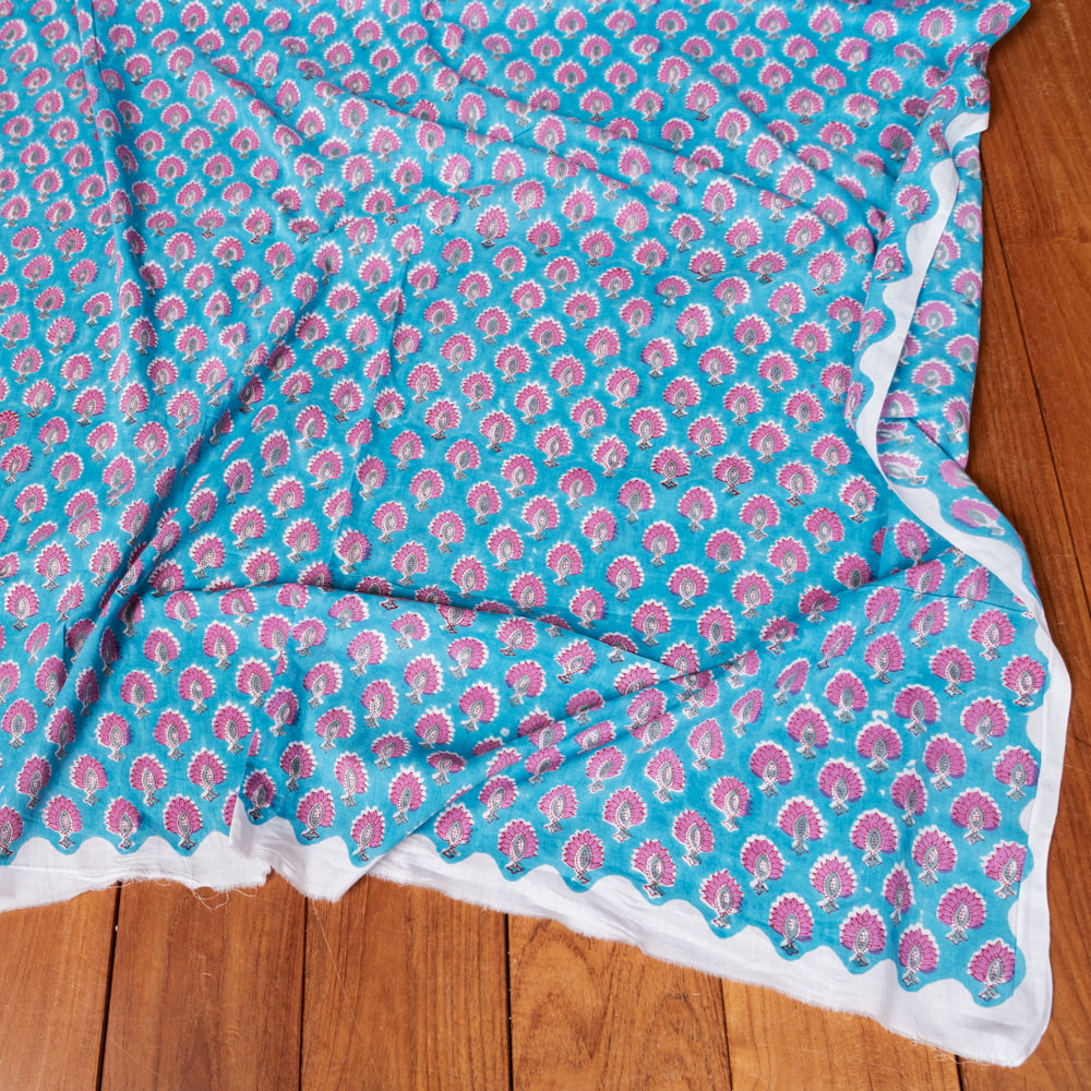 【5個セット】〔1m切単位り売り〕ジャイプル 職人手作り木版染め 色彩美しいボタニカルデザイン おしゃれ 生地 花柄 テーブルクロス 刺繍素材などへ〔幅約108cm〕 - ピーコックブルー系