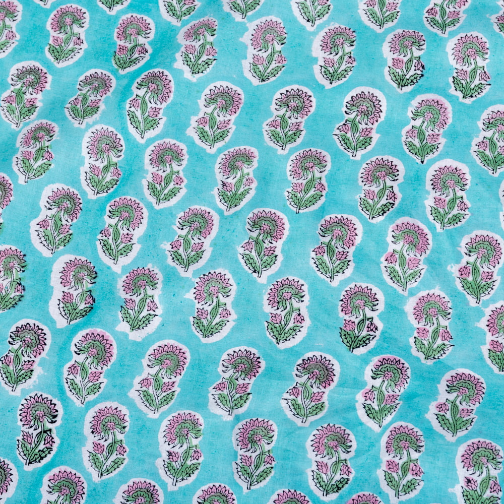 〔1m単位切り売り〕ジャイプル 職人手作り木版染め 色彩美しいボタニカルデザイン おしゃれ 生地 花柄 テーブルクロス 刺繍素材などへ〔幅約109cm〕 - ミントグリーン系 x 5個
