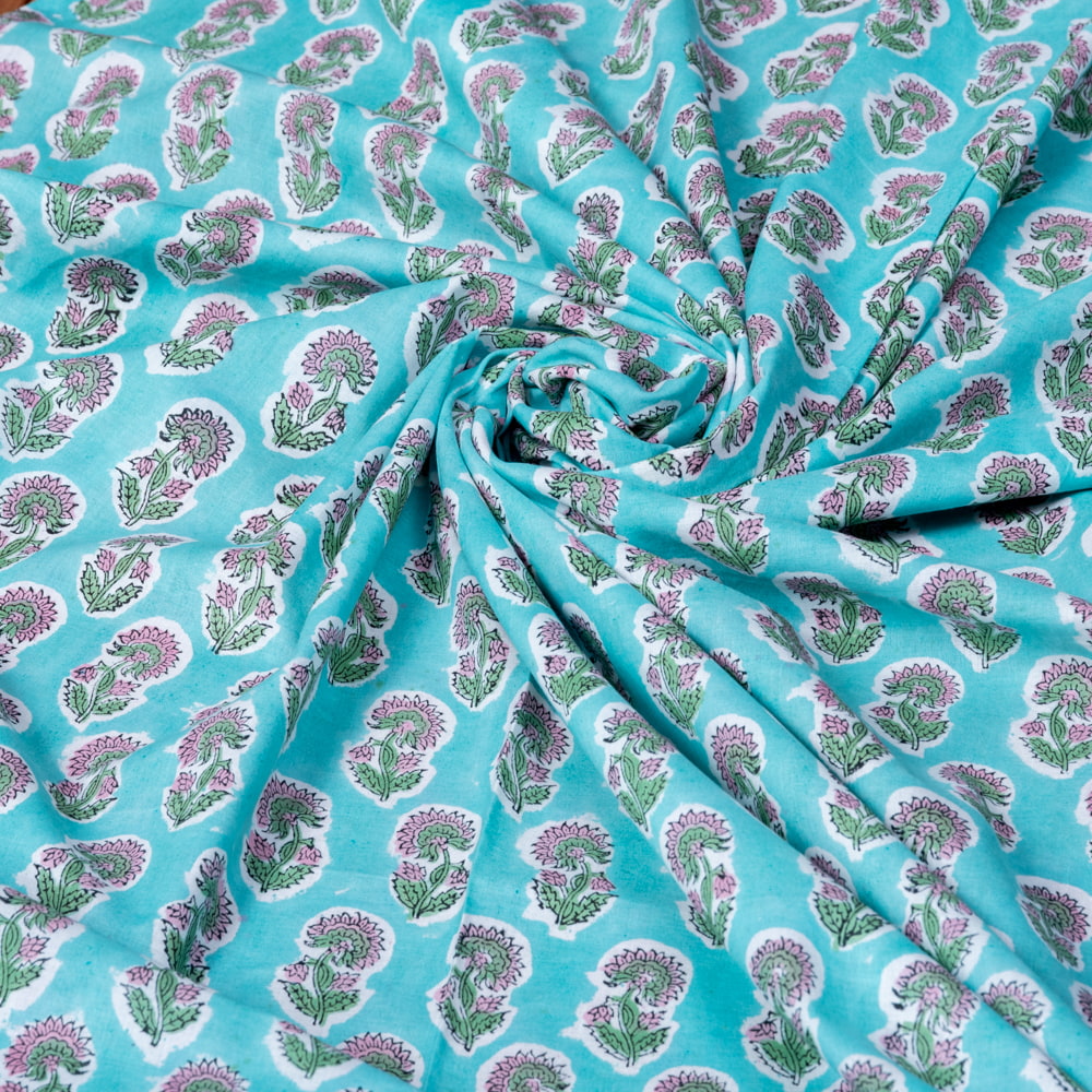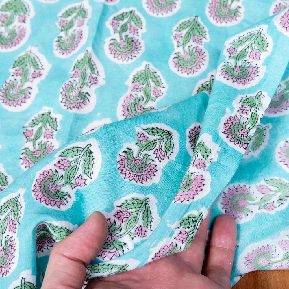 【5個セット】〔1m切単位り売り〕ジャイプル 職人手作り木版染め 色彩美しいボタニカルデザイン おしゃれ 生地 花柄 テーブルクロス 刺繍素材などへ〔幅約109cm〕 - ミントグリーン系