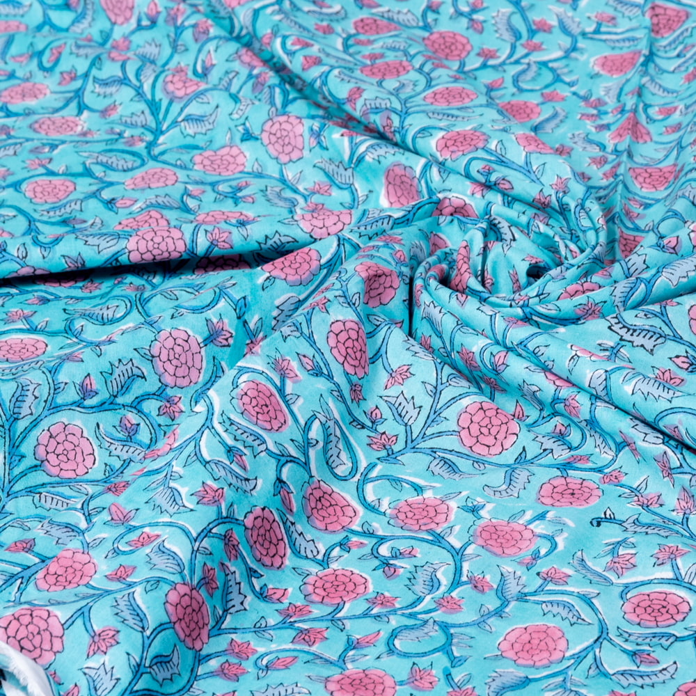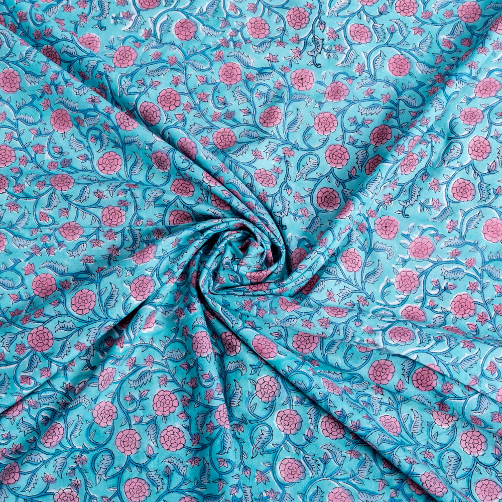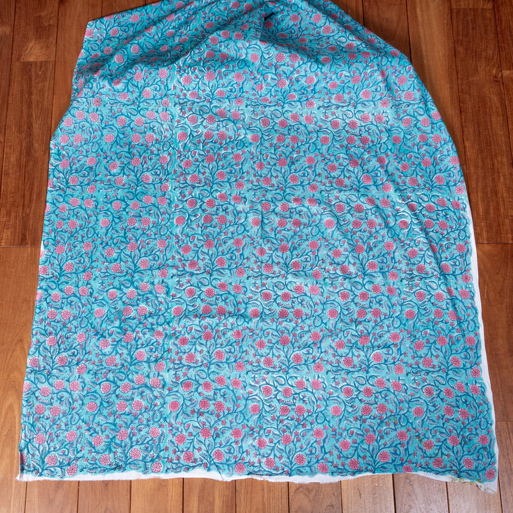 〔1m単位切り売り〕ジャイプル 職人手作り木版染め 色彩美しいボタニカルデザイン おしゃれ 生地 花柄 テーブルクロス 刺繍素材などへ〔幅約111cm〕 - 青緑系 x 5個