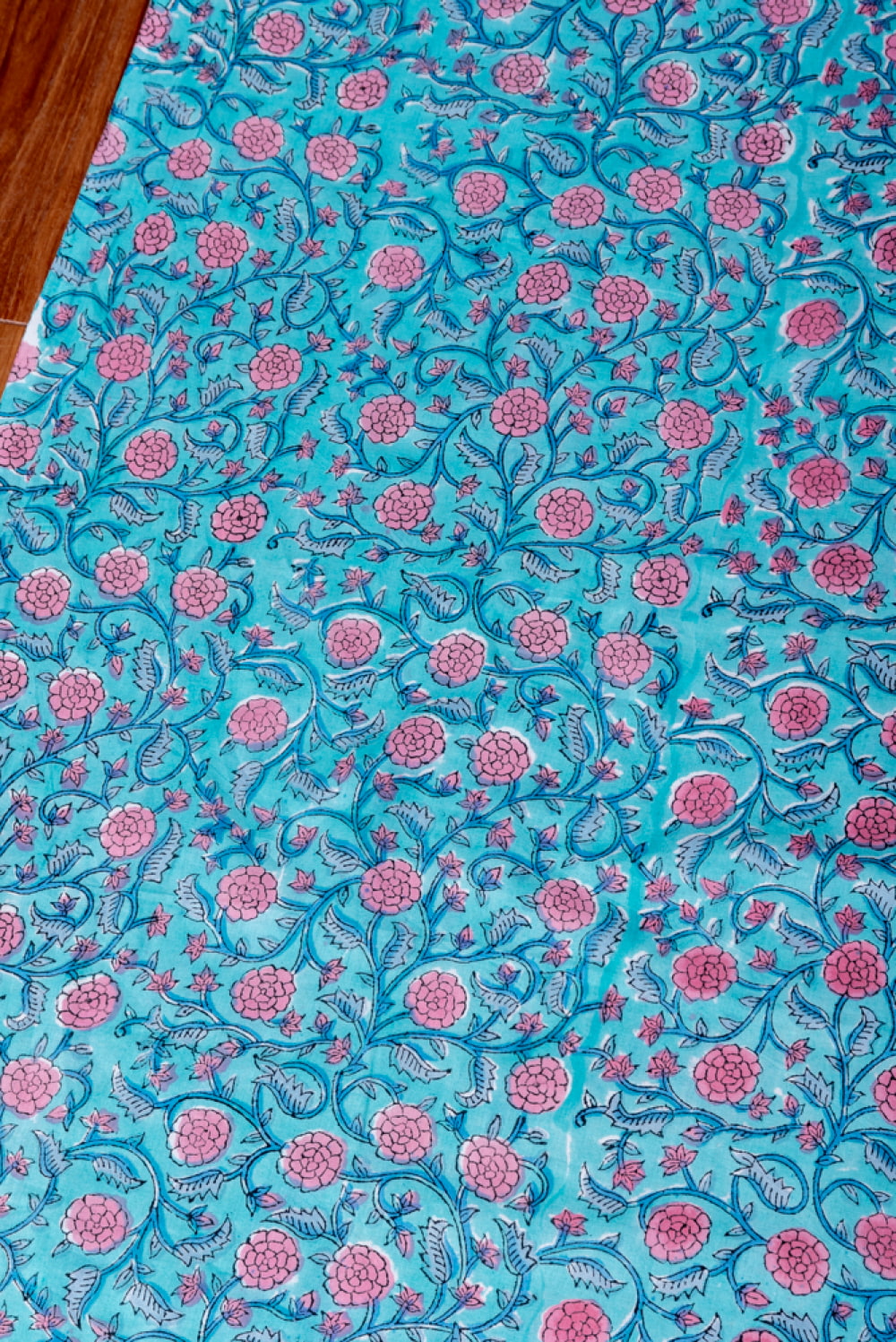 とってもかわいい生地がジャイプルからやってきました。どこかプロヴァンスなテイストも感じさせる、魅力的な色彩とデザイン。職人さんが全て手作りしており、インドらしい木版と鮮やかな色彩がきわだつ、インド綿100%のファブリックです。ナチュラルな風合いは、派手すぎずほどよく上品な雰囲気で、どんなお部屋にも馴染み、相性良くフィットしてくれそうです。