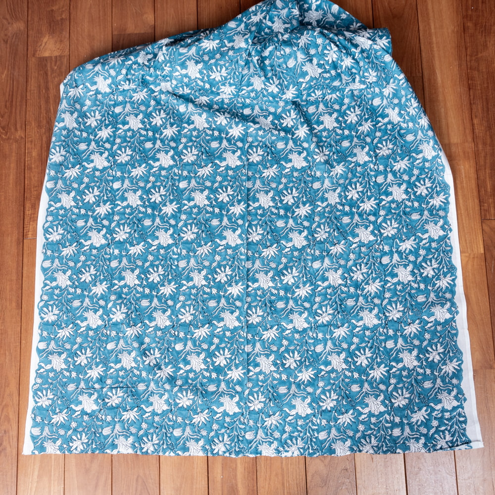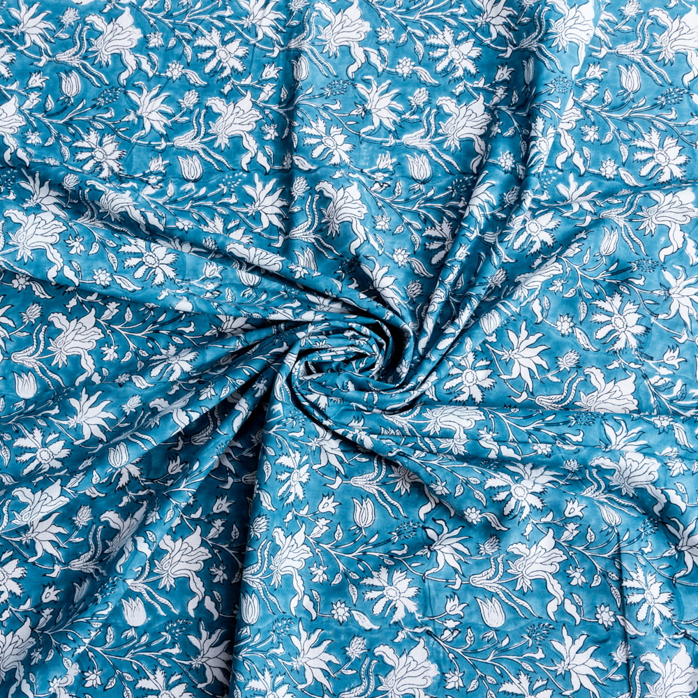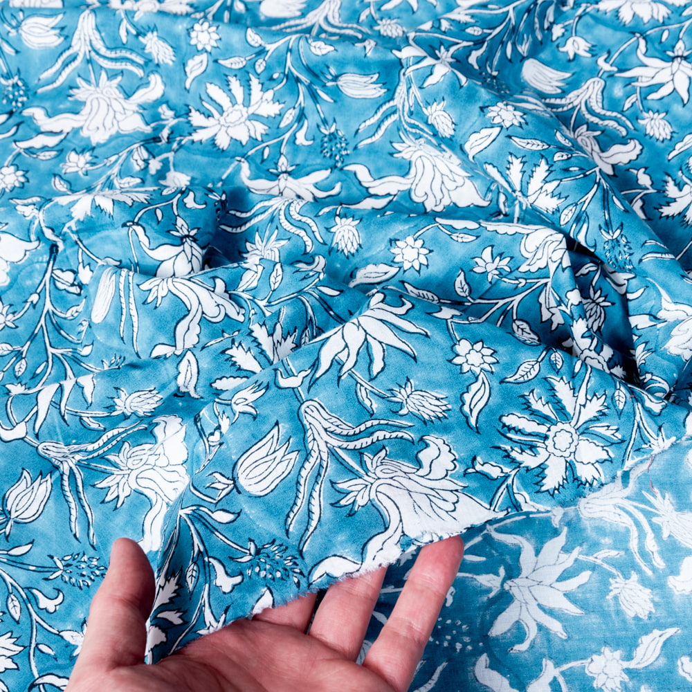 〔1m単位切り売り〕ジャイプル 職人手作り木版染め 色彩美しいボタニカルデザイン おしゃれ 生地 花柄 テーブルクロス 刺繍素材などへ〔幅約112.5cm〕 - ブルー系 x 5個