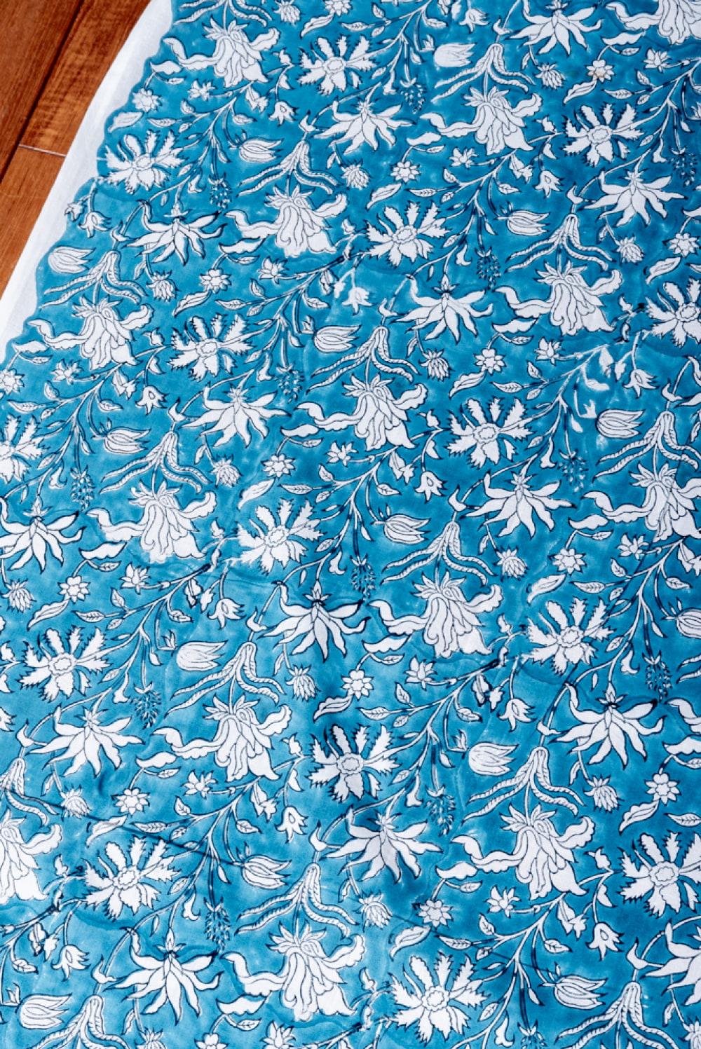 木版染めとは、ウッドブロック(木版)を用いて一つ一つ模様を染めこんだ優雅で贅沢な仕上がりの布です。大量生産には向かない、非常に時間のかかる丁寧な手仕事の賜物といえます。インドは美しい布の宝庫ですが、その中でも特に素敵な一枚に仕上がっています。ハンドメイドのウッドブロックプリントにしか出せない、独特のムラがありとても雰囲気があります。