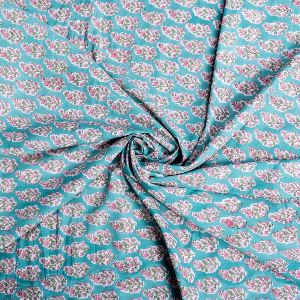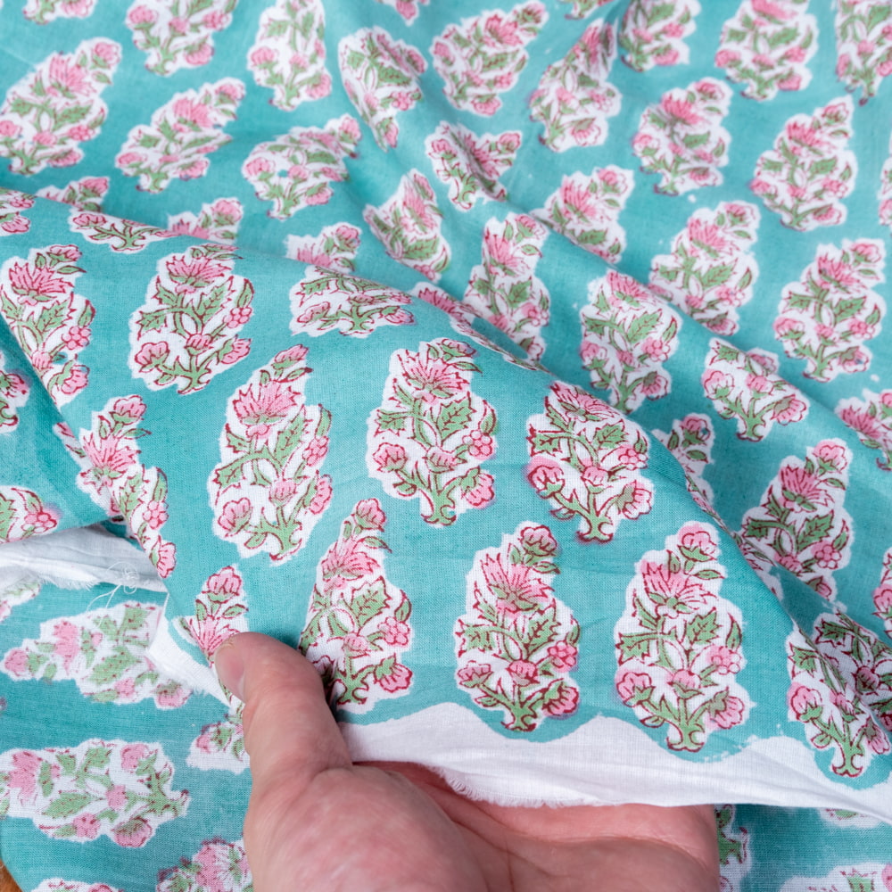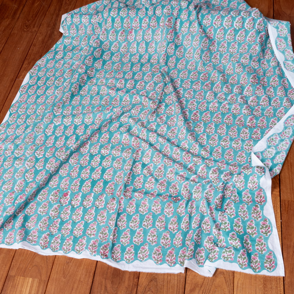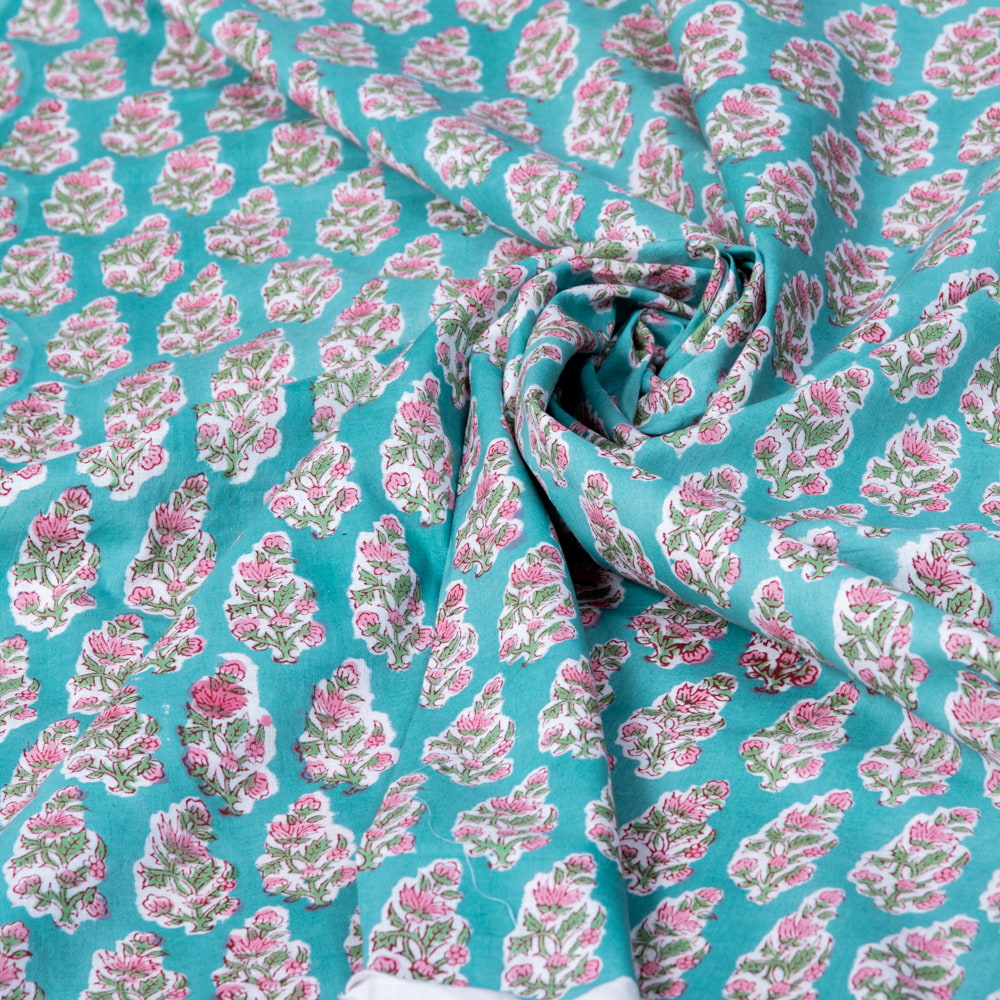 〔1m単位切り売り〕ジャイプル 職人手作り木版染め 色彩美しいボタニカルデザイン おしゃれ 生地 花柄 テーブルクロス 刺繍素材などへ〔幅約112cm〕 - グリーン系 x 5個