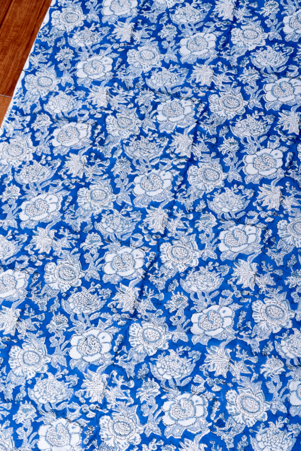 〔1m単位切り売り〕ジャイプル 職人手作り木版染め 色彩美しいボタニカルデザイン おしゃれ 生地 花柄 テーブルクロス 刺繍素材などへ〔幅約113cm〕 - ブルー 系 x 5個