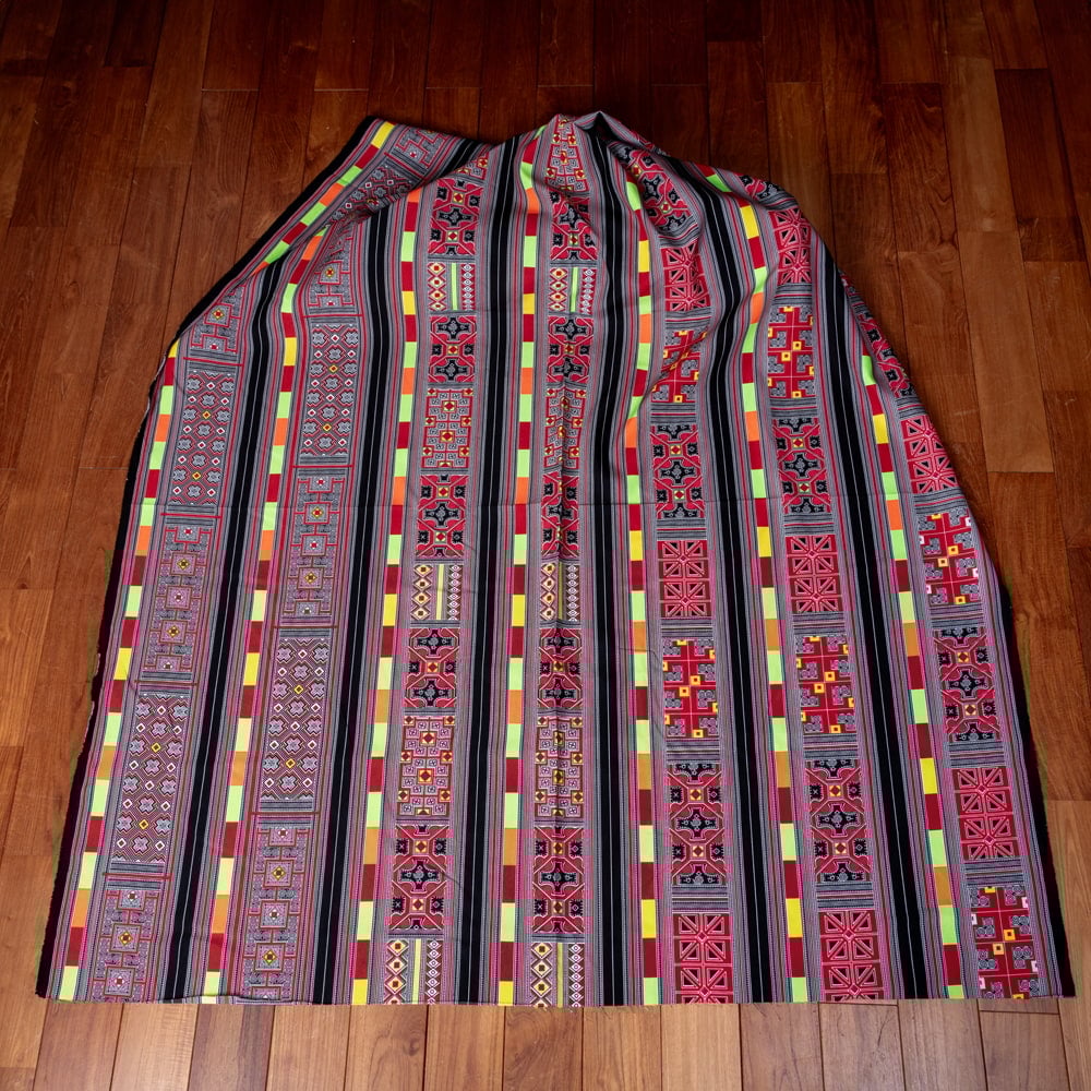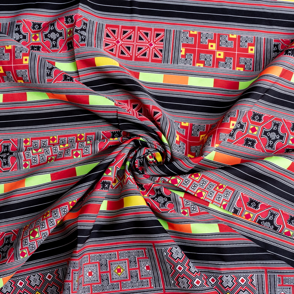 ベトナムの市場で見つけてきたモン族柄を、鮮やかにプリントした布です。ベトナムのモン族の伝統的な文化からインスパイアされた美しい柄と、昇華転写の技術が合わさっています。昇華転写プリントは、生地にインクを染み込ませる特殊な技術で、鮮やかな色彩と解像度の高さが魅力です。モン族の細かい刺繍の表現と、色鮮やかさの表現するのに適した手法ですね。ちょっと遠くからみると、結構リアルで刺繍風に見えます。