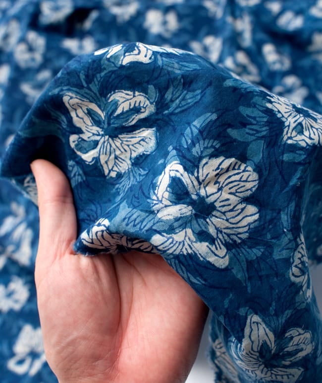 インディゴとの青による色合いが美しく、ウッドブロックの手作りによる模様もとても美しいこちらの布。手芸用の布としてはもちろんインテリア用のカバーや飾り布として様々な場所でお使いいただけます。ソファカバーやカーテン、テーブルクロス等々色々な使いみちが考えられますね。ナチュラルな風合いが良いので、オリジナルのスカーフや壁飾りにしても素敵です。■便利な計り売り!