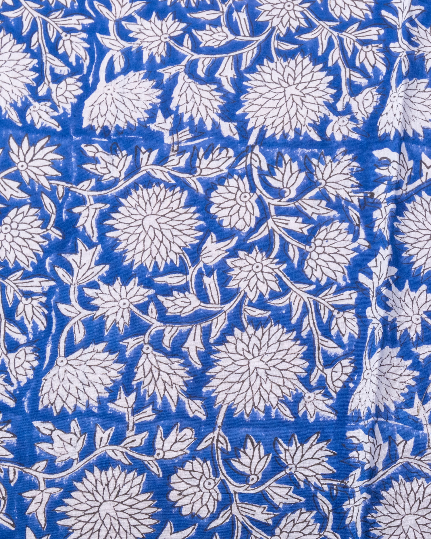 【3個セット】〔1m単位切り売り〕ジャイプル 職人手作り木版染め 色彩美しいボタニカルデザイン〔幅約113cm〕〔ブルー系 更紗柄〕 おしゃれ 生地 テーブルクロス 手芸素材などへの商品写真 2枚目 インドらしい味わいのある布地です。