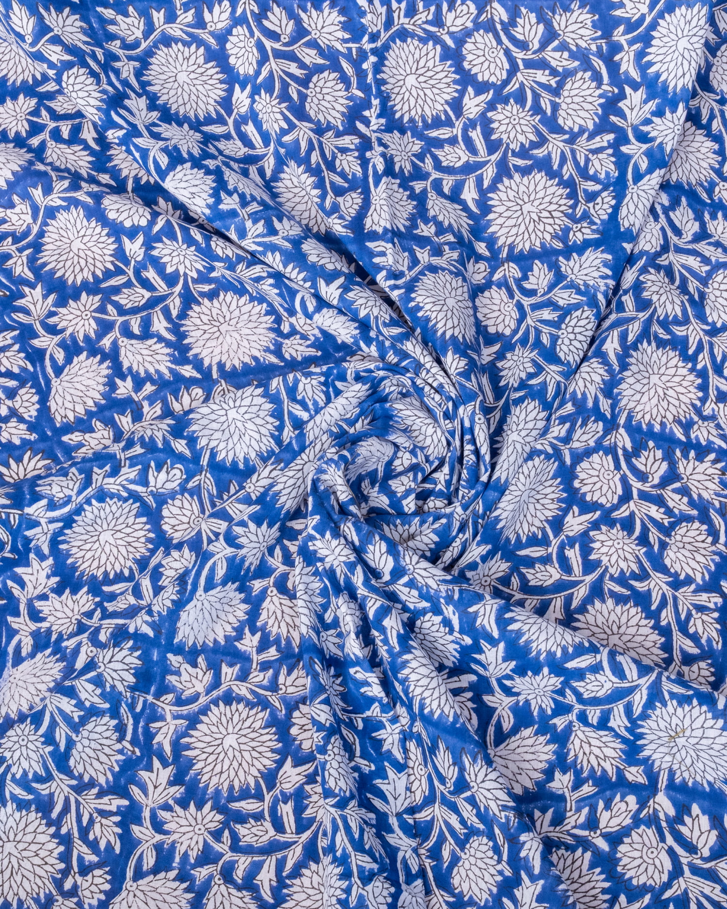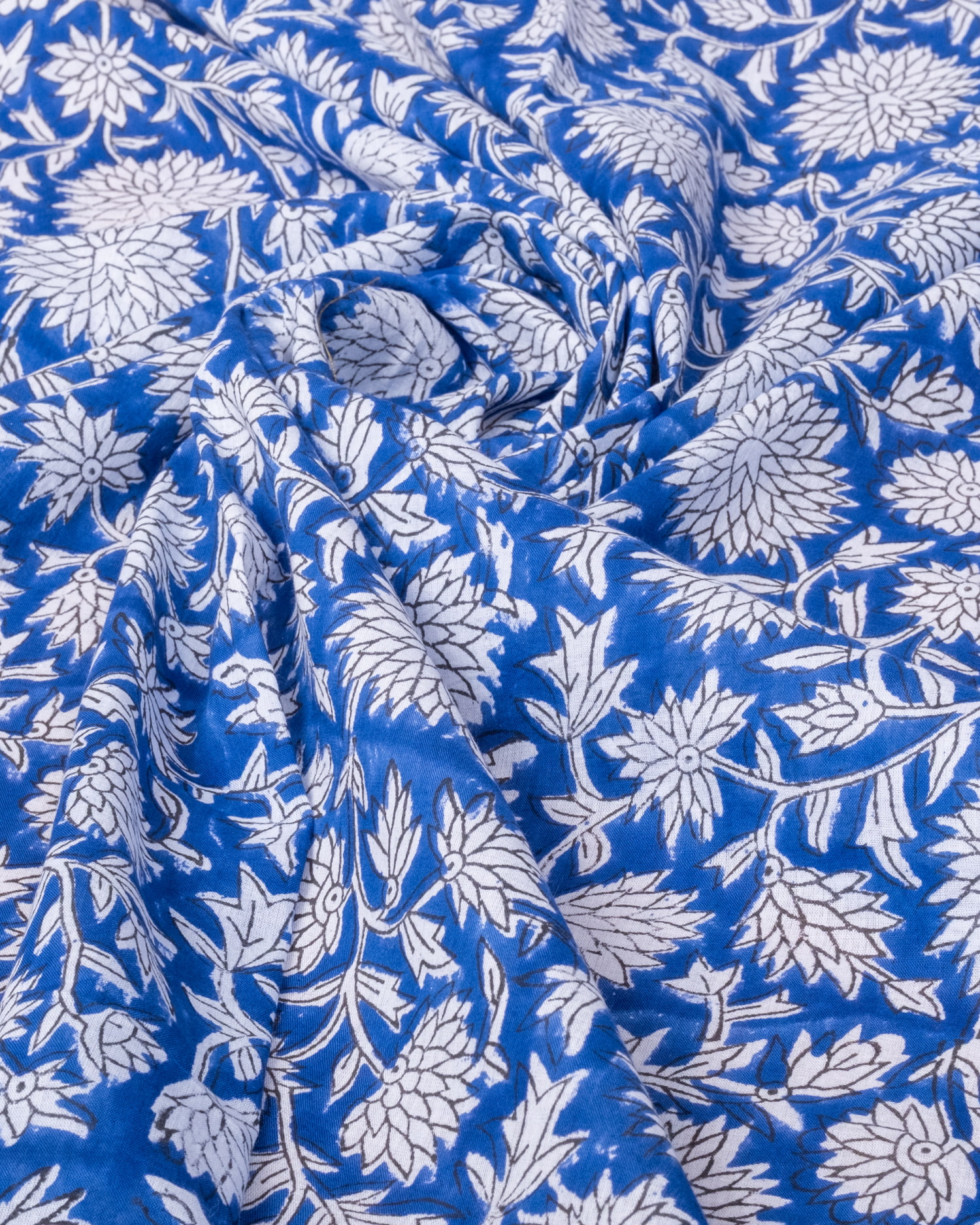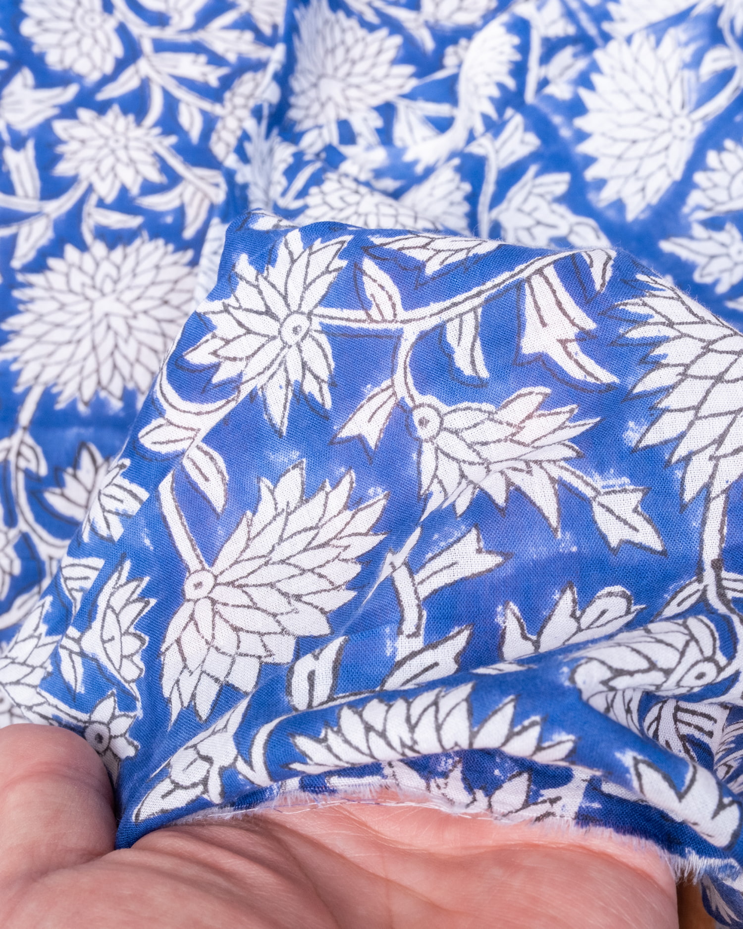 【3個セット】〔1m単位切り売り〕ジャイプル 職人手作り木版染め 色彩美しいボタニカルデザイン〔幅約113cm〕〔ブルー系 更紗柄〕 おしゃれ 生地 テーブルクロス 手芸素材などへの商品写真 5枚目 インドならではの布ですね。